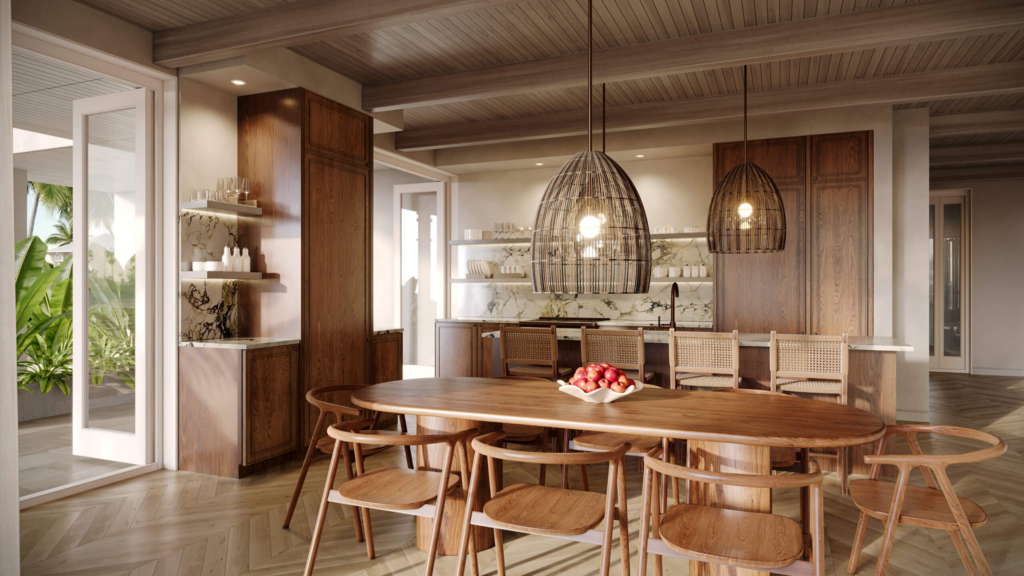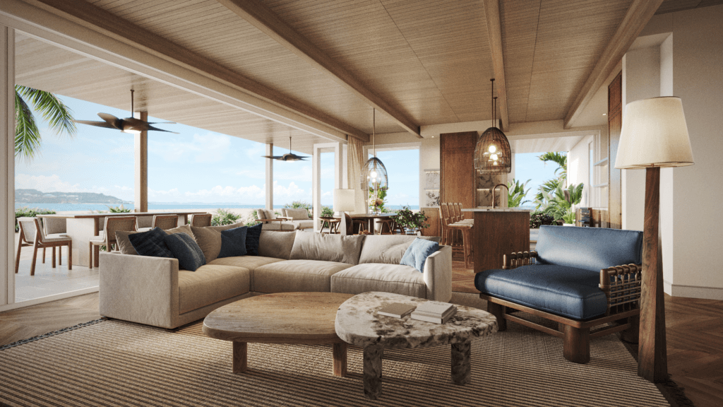 One of the highlights of this residence is the L-Shaped wraparound terrace, accessible from both the great room, kitchen, and primary bedroom. This outdoor oasis offers a serene escape, with an optional built-in outdoor kitchen that allows for effortless al fresco dining, creating an intimate atmosphere for enjoying meals with friends and loved ones while enjoying the gentle ocean breeze and stunning views.