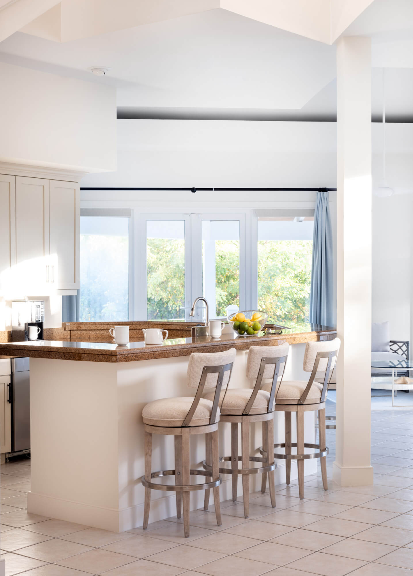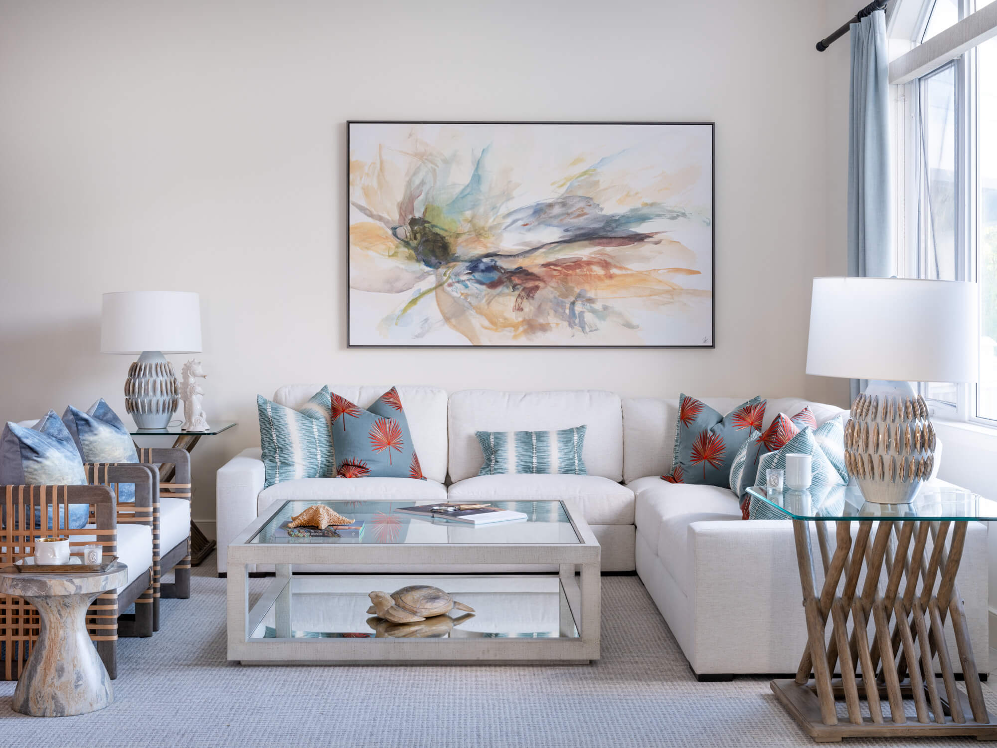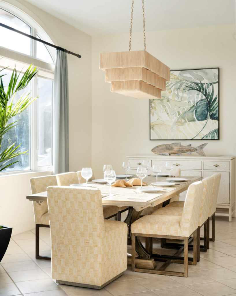 Just inside the entrance, a staircase leads to the second-floor observatory level, offering stunning 360-degree views of the beach, Winding Bay, and the golf course. The heart of the home is an open-plan great room, newly updated with fresh furnishings, bedding, and accessories. The décor is refined yet relaxed, featuring soothing tones of aqua and beige that complement the coastal setting. A large sectional sofa and oversized lounge chairs create an inviting living space accented by striking wall art.