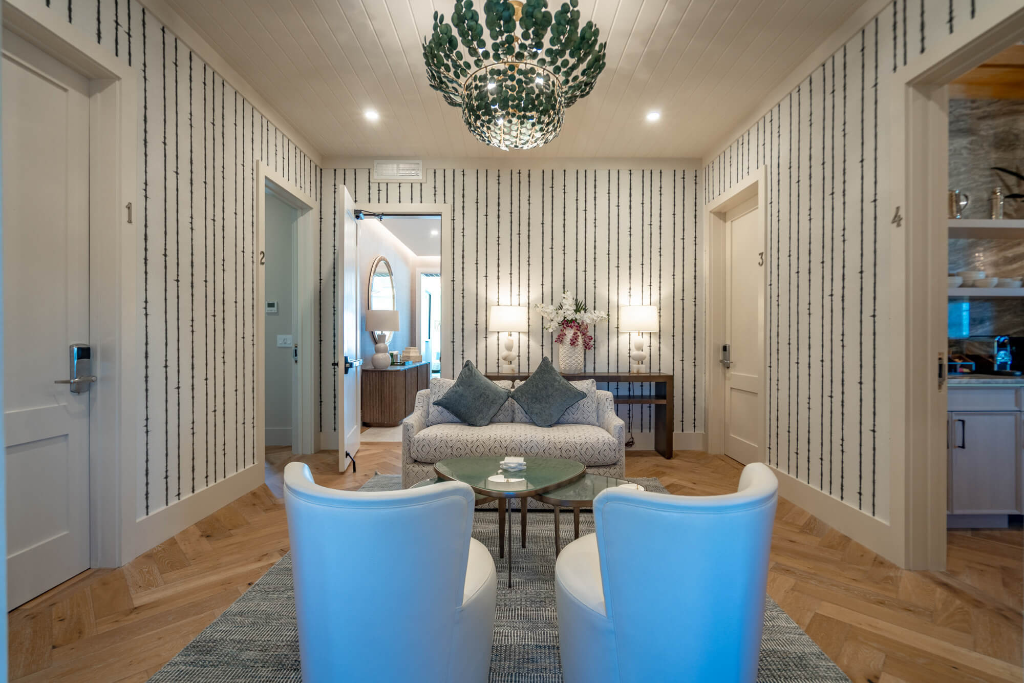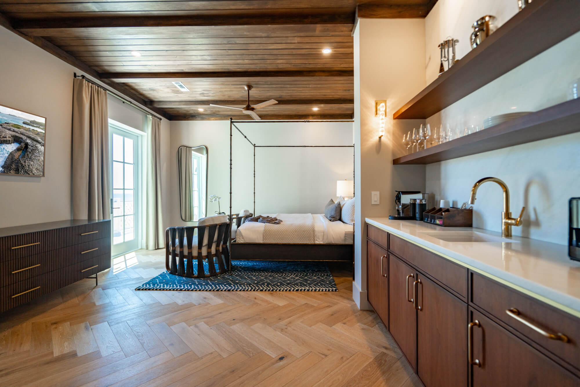 Set above The Bay Club, the Club Rooms offer an intimate retreat designed for unhurried stays and effortless comfort. Each one-bedroom suite is individually styled, yet unified by a shared sensibility—warm woods, natural textures, and a calm coastal palette that feels refined without being formal. Two of the rooms also offer the option to be adjoining, ideal for families or guests traveling togeth