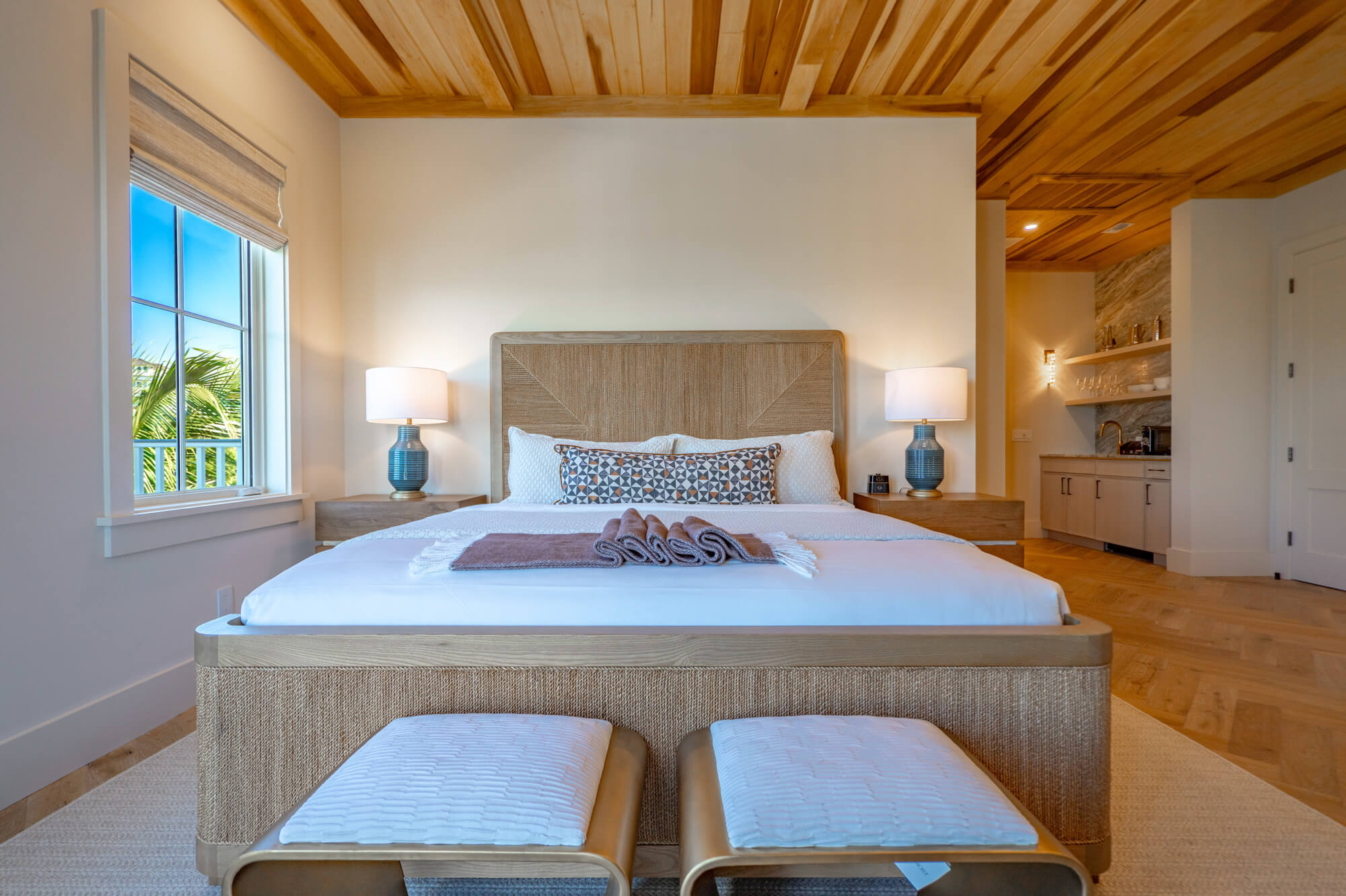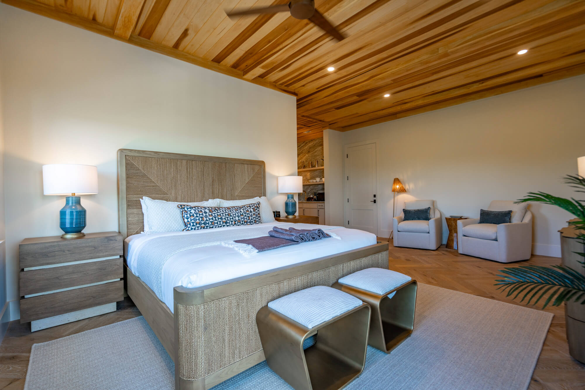 Inside, sleeping areas are anchored by king beds dressed in layered neutrals, set beneath wood-planked or vaulted ceilings and paired with thoughtful seating nooks or writing desks. Select rooms open to private balconies, where café tables or lounge chairs look out over palms, fairway greens, or the surrounding neighborhood—an easy place to start or end the day.