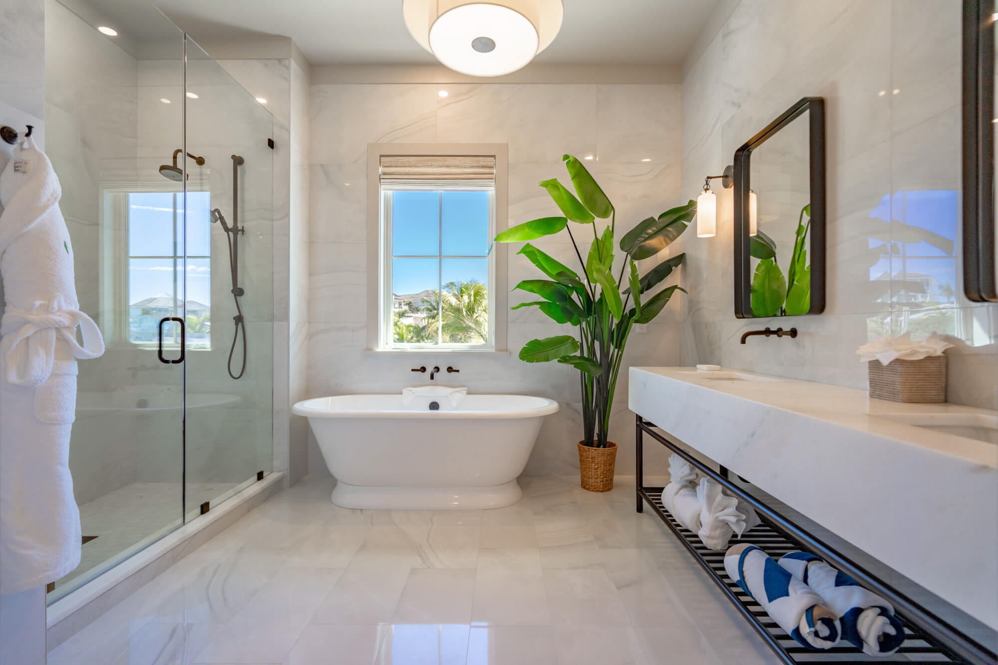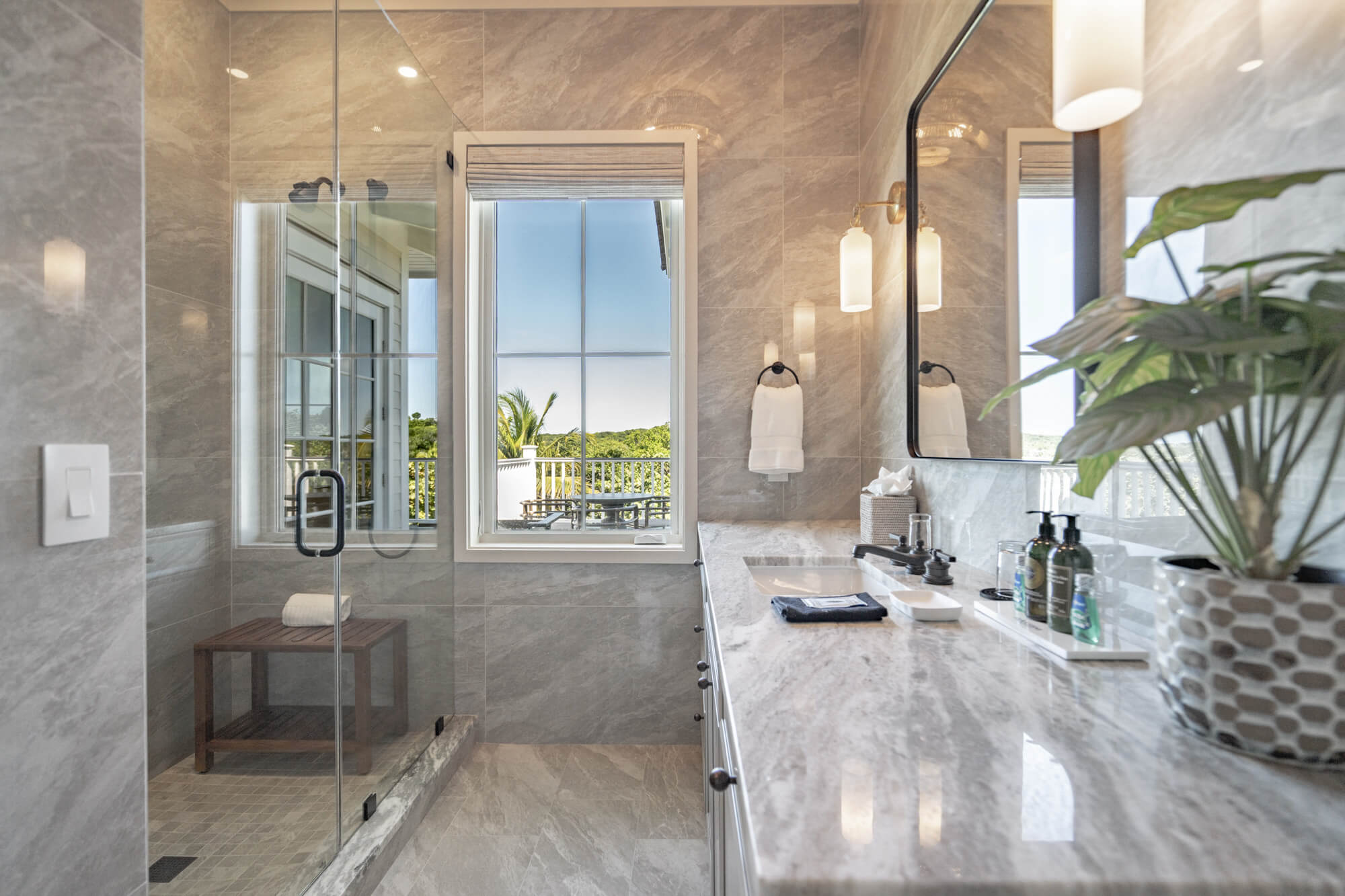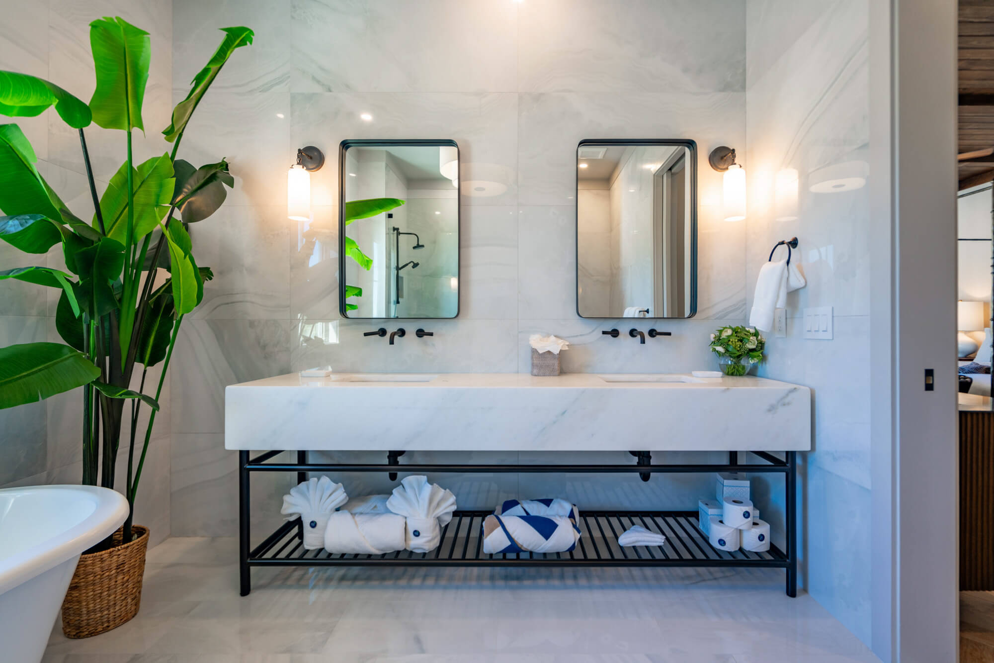 Bathrooms are a standout across the collection, finished with stone tile, glass-enclosed showers, and freestanding soaking tubs positioned beneath sunlit windows. Each suite includes a well-appointed wet bar with open shelving, stone counters, and coffee service for easy mornings and relaxed evenings. Just beyond your door, the Horizon Lounge and Club amenities are moments away, making the Club Rooms a seamless blend of privacy and connection at the heart of the Bay Club.