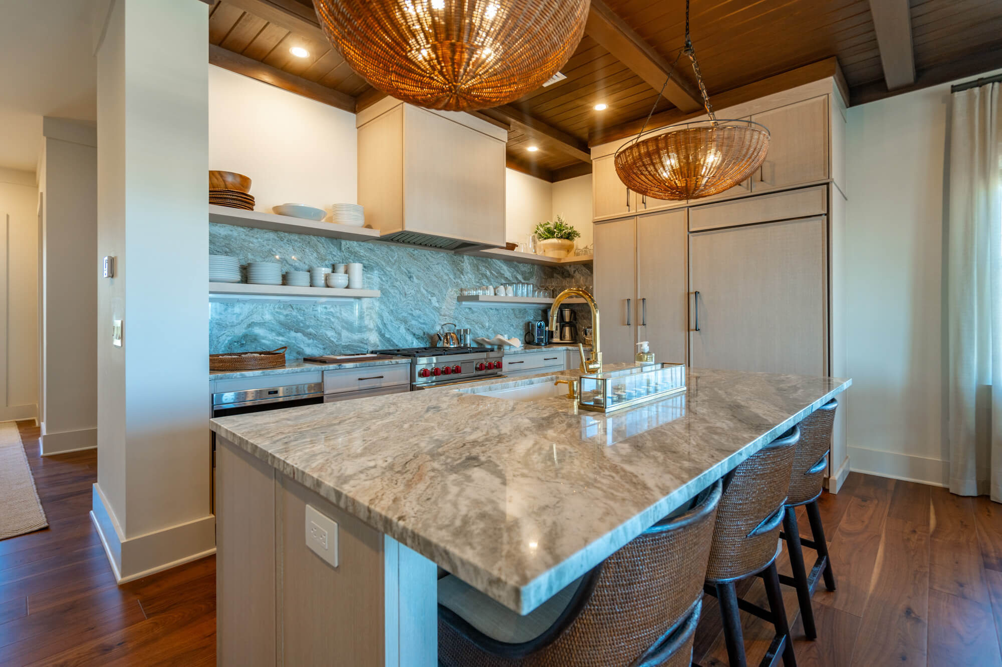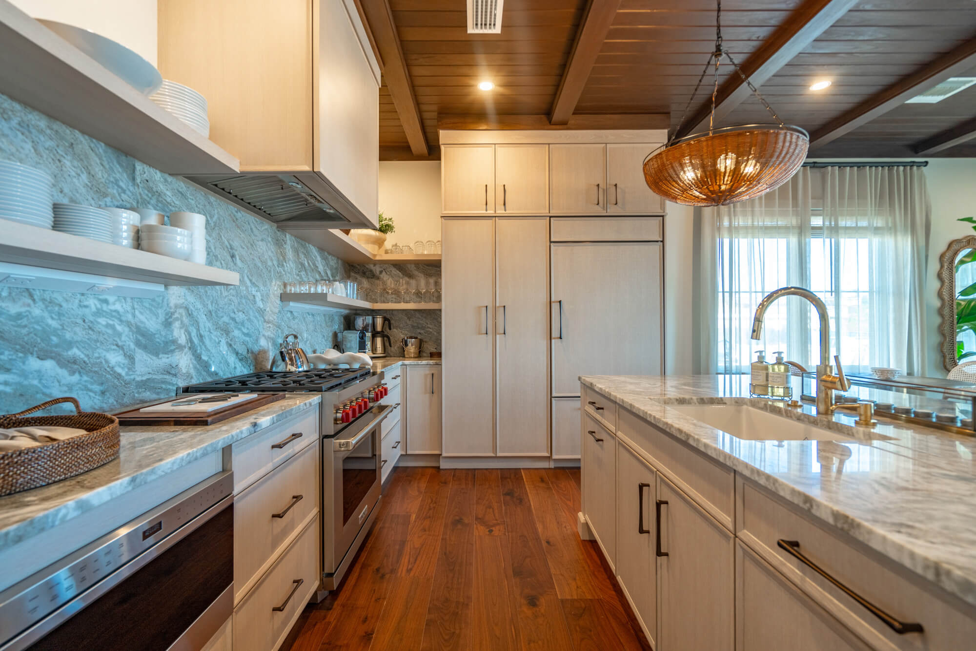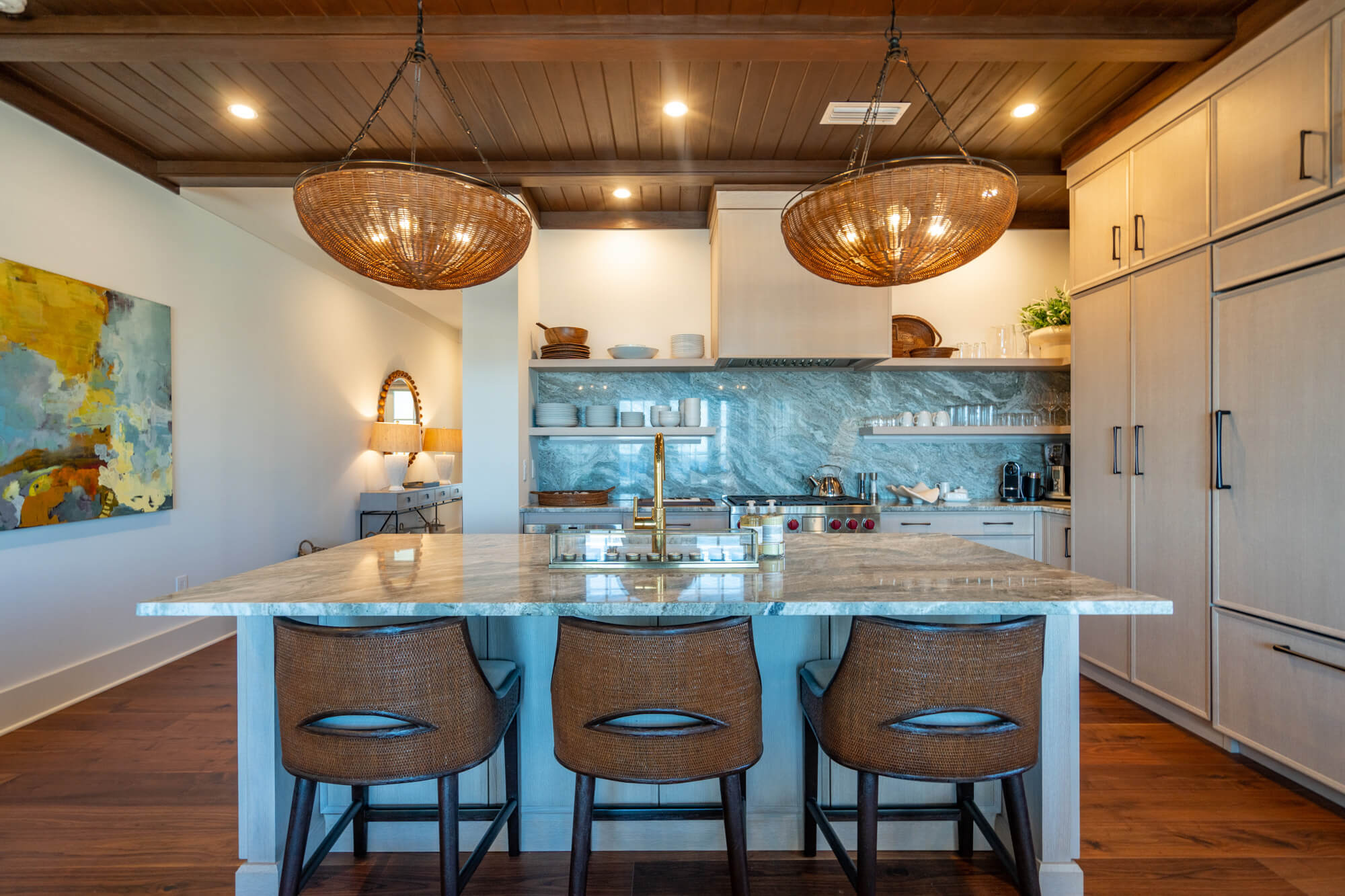 GypSea feels airy from the moment you step inside. A long entry hall opens into a living space defined by rich wood floors and a warm tongue-and-groove ceiling, where woven pendant lights hang over a pale stone island. The kitchen pairs light wood cabinetry with dramatic marble veining and open shelving, anchored by a generous island that faces directly toward the sea. Everything flows outward to folding glass doors and a covered terrace, where dining and lounging overlook the water and infinity pool beyond.