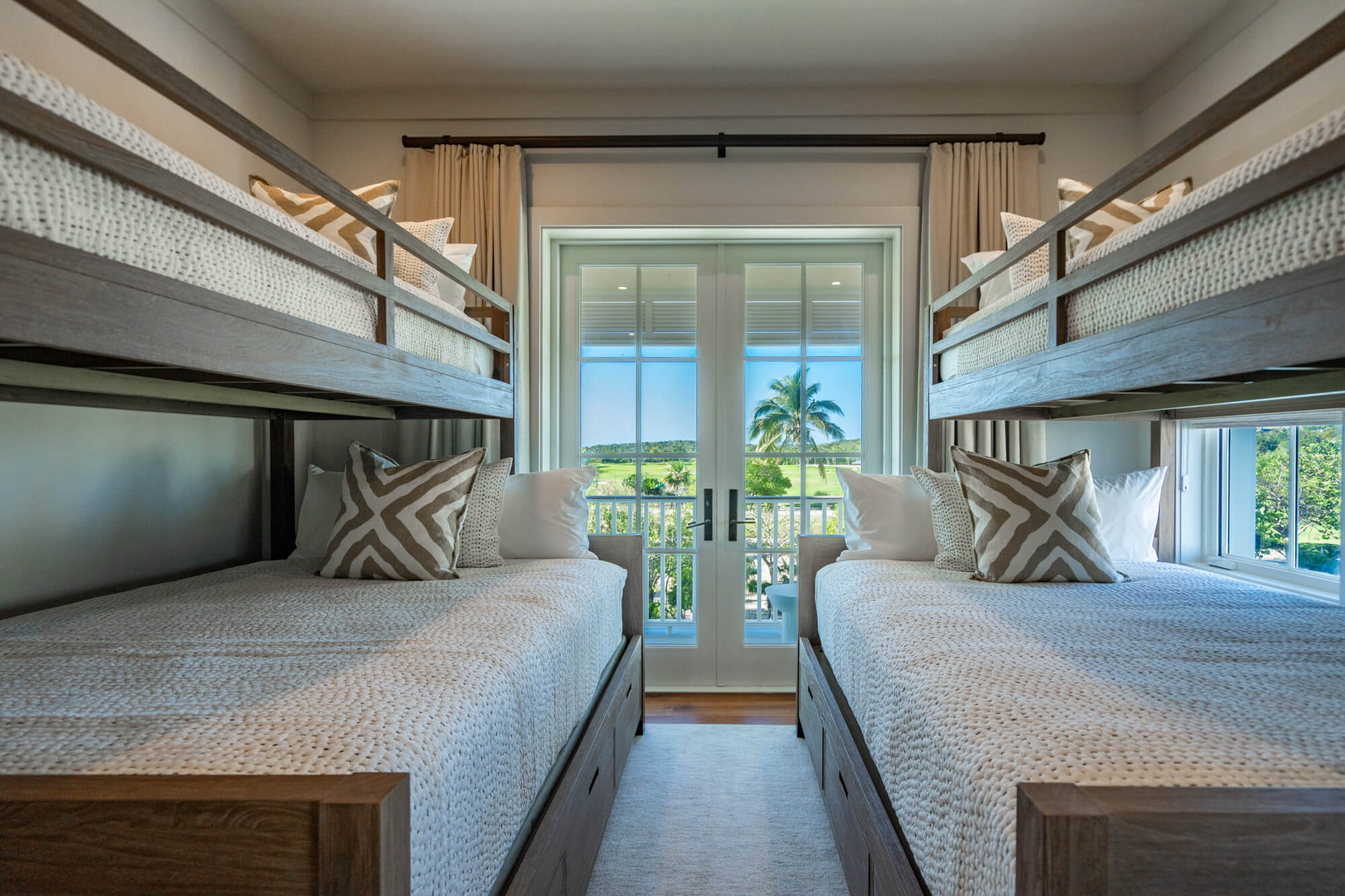 The downstairs guest bedroom offers its own quiet retreat, with soft textures and access to a private patio terrace. Upstairs, a bunk-style bedroom with two double beds opens to a balcony overlooking the golf course, making it ideal for children or visiting guests.