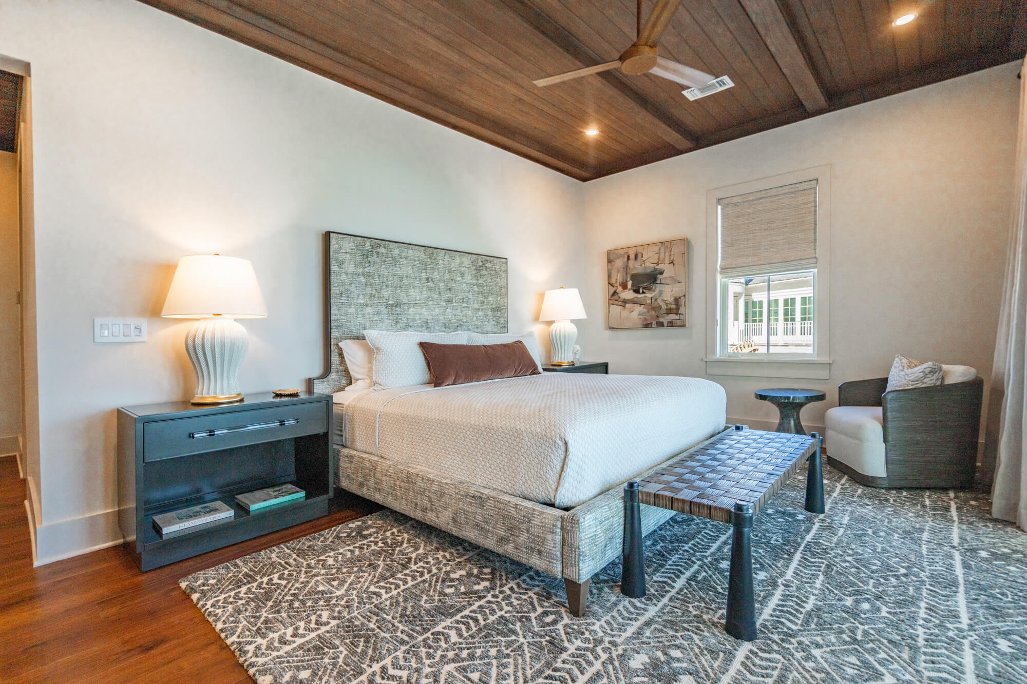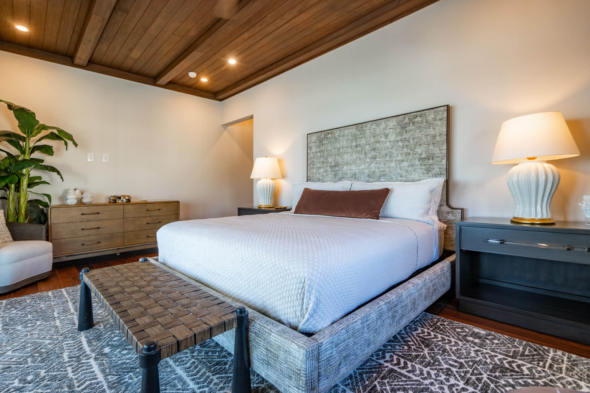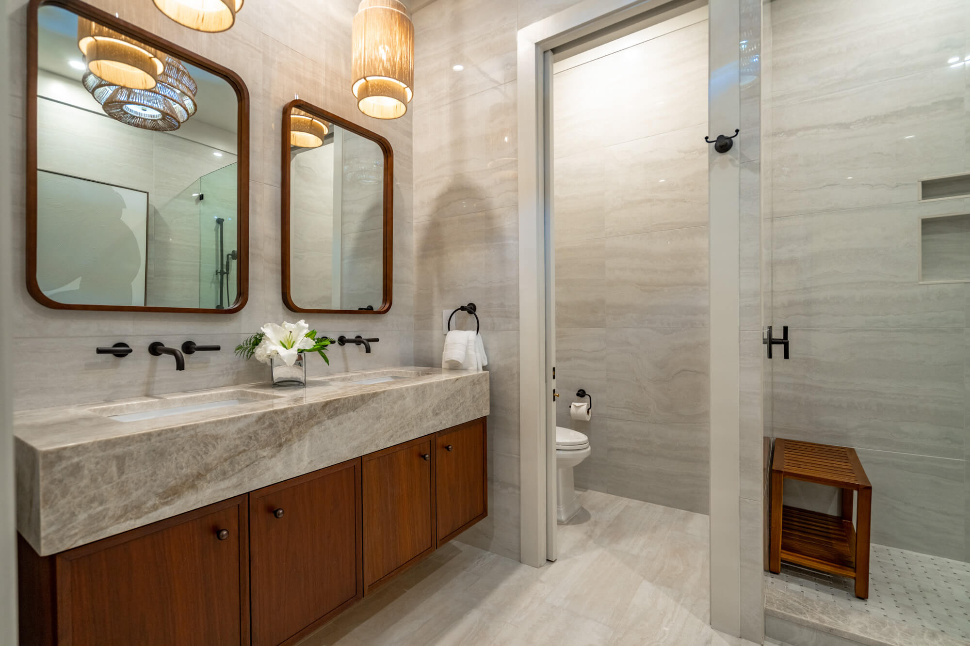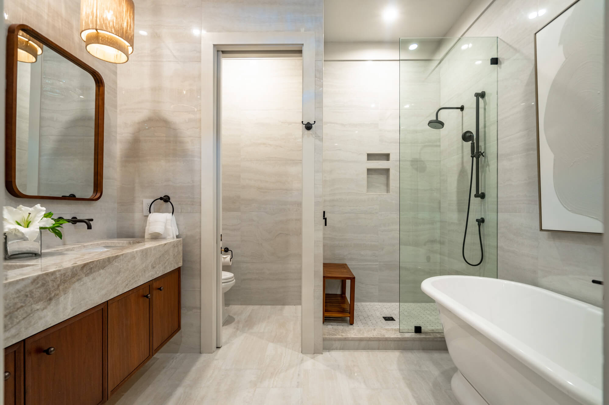 The primary suite is oriented toward the ocean, centered around a king bed and layered in natural tones. French doors lead to a covered balcony with uninterrupted turquoise views. The ensuite bath features a soaking tub, a glass walk-in shower, a double vanity, and a private water closet — thoughtfully laid out for comfort and ease.