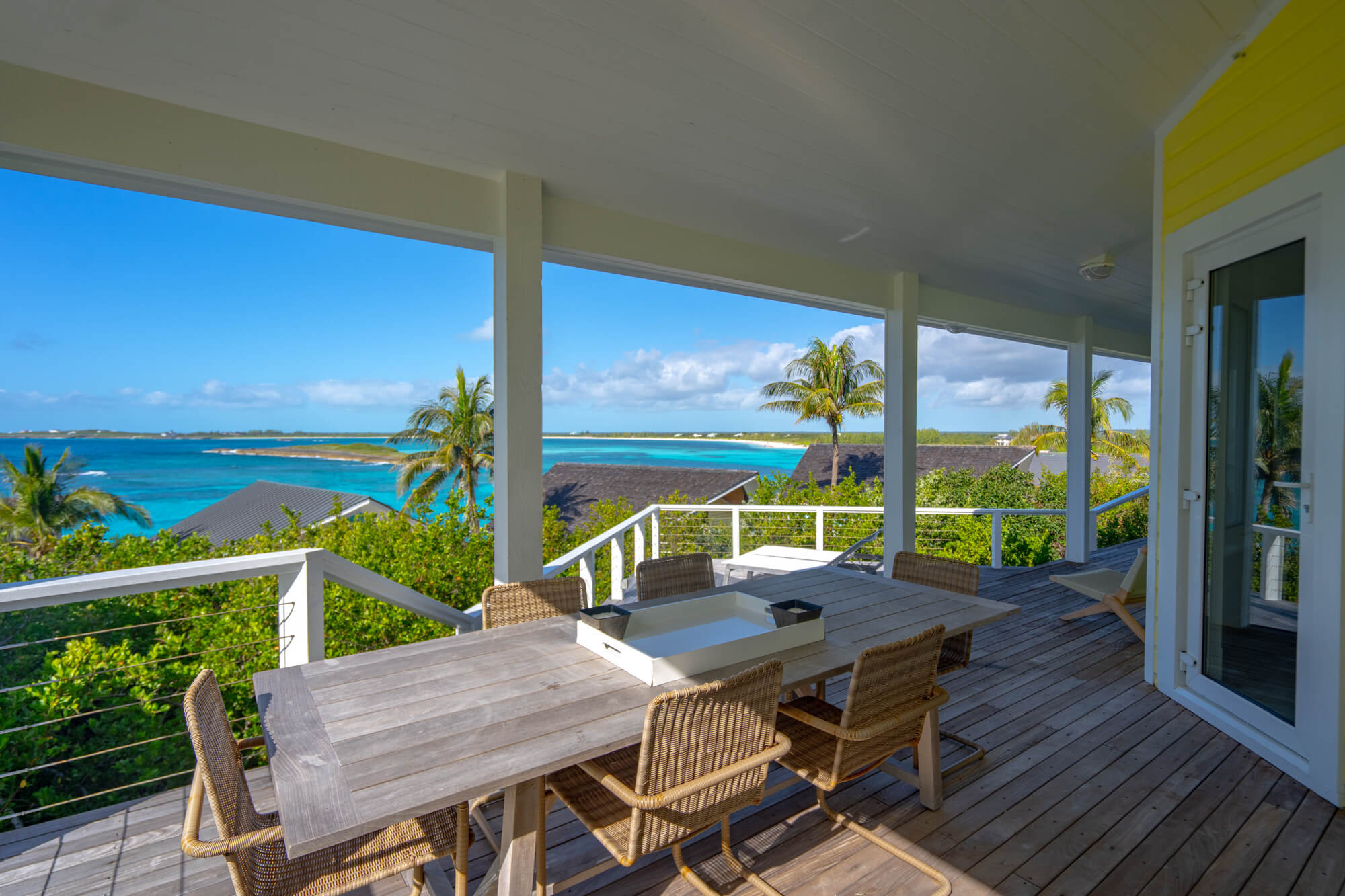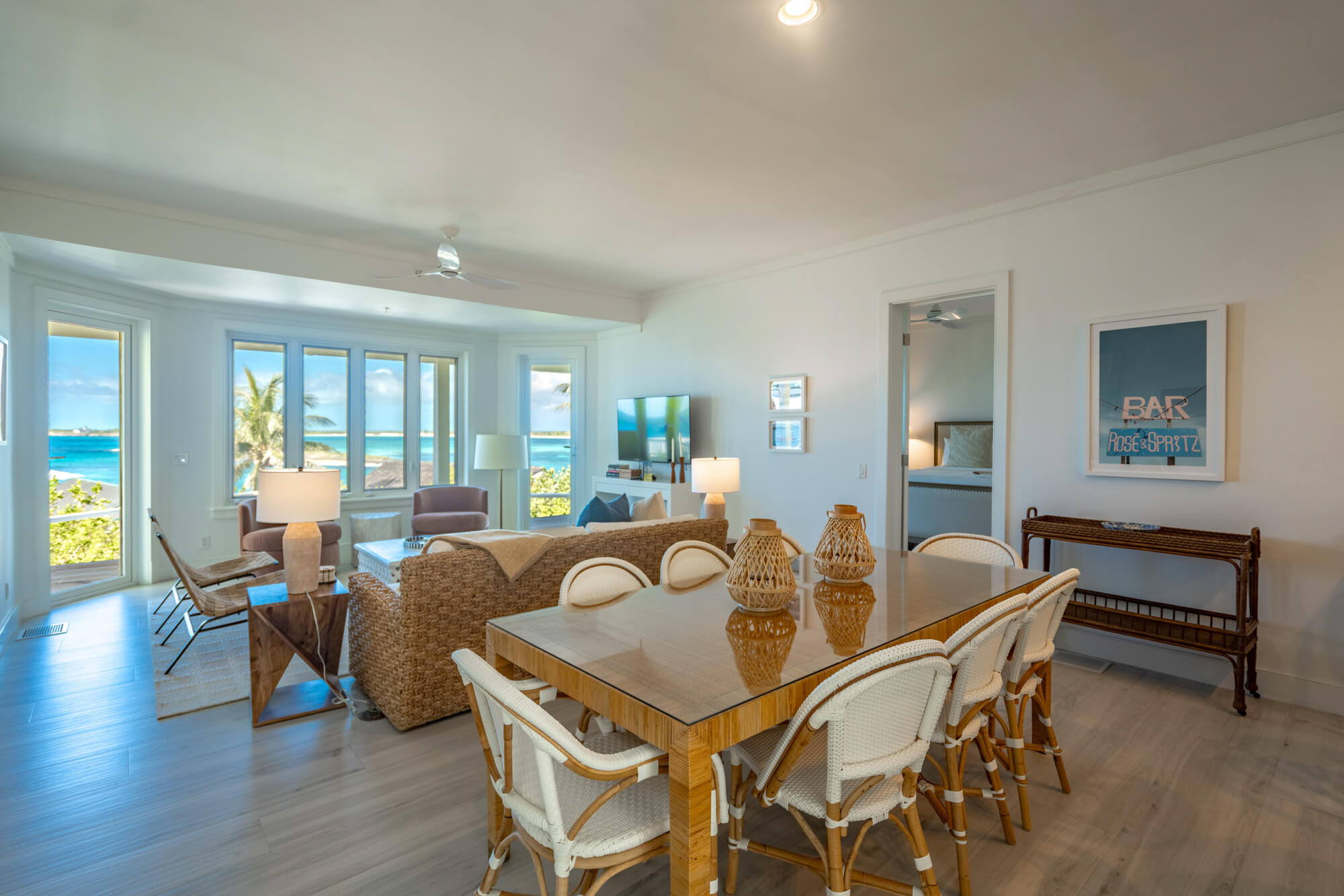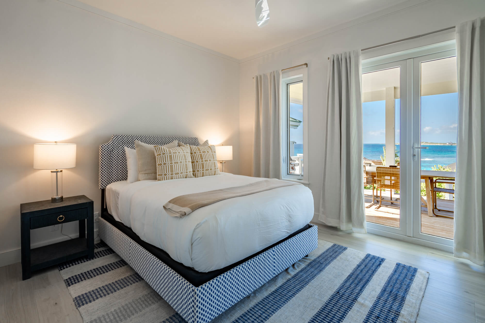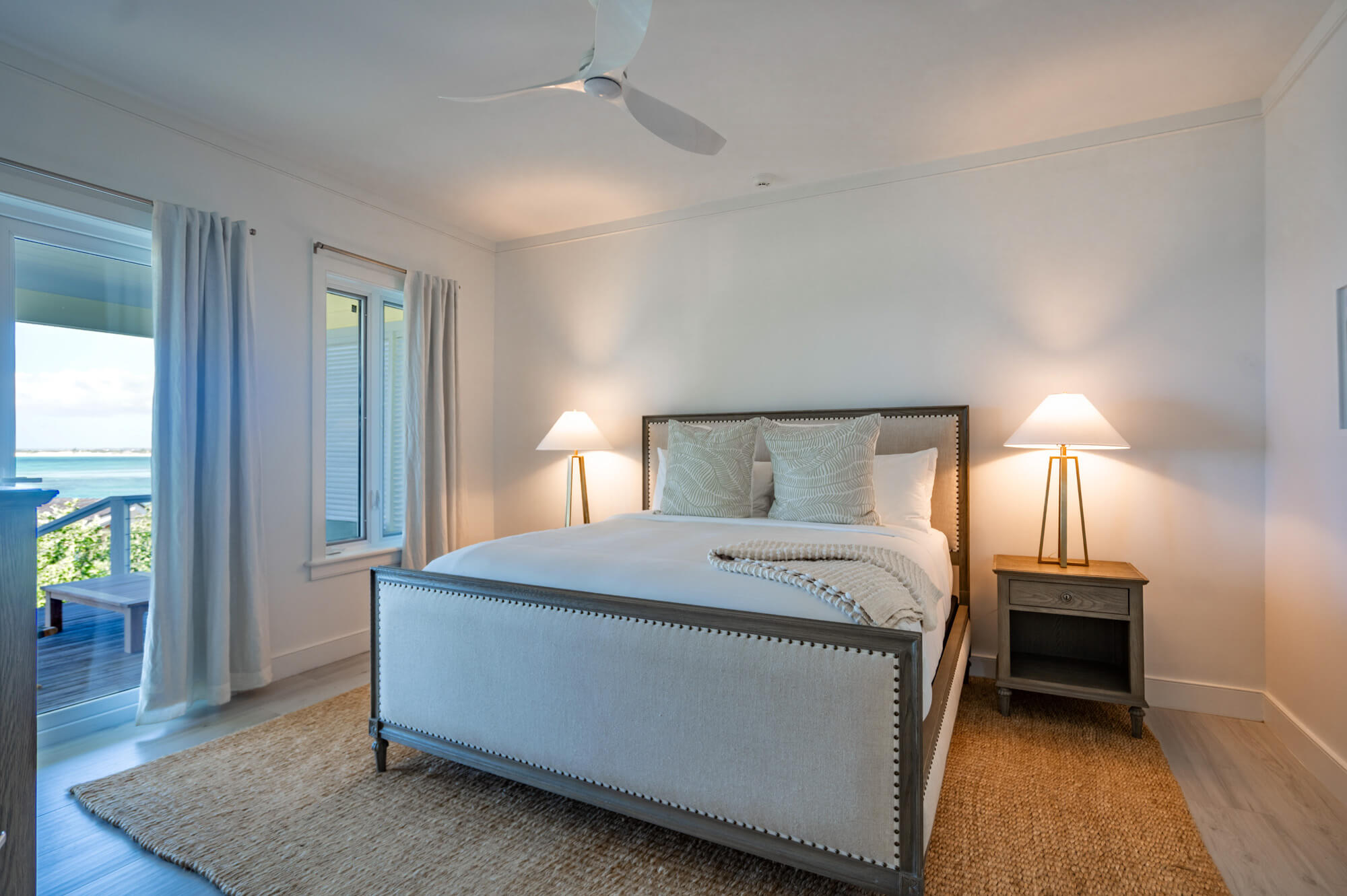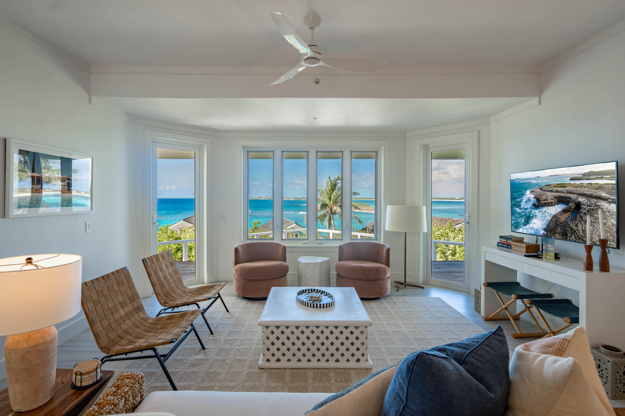 Crescent Moon feels storied and distinct, perched above the calm curve of the bay with sweeping views toward the beach club and palm-lined shoreline. The architecture carries a quiet sense of history—rich wood floors, exposed ceiling beams, and verandas that stretch wide over the water.