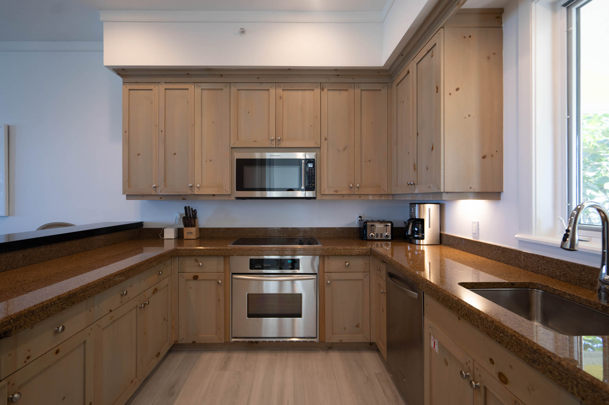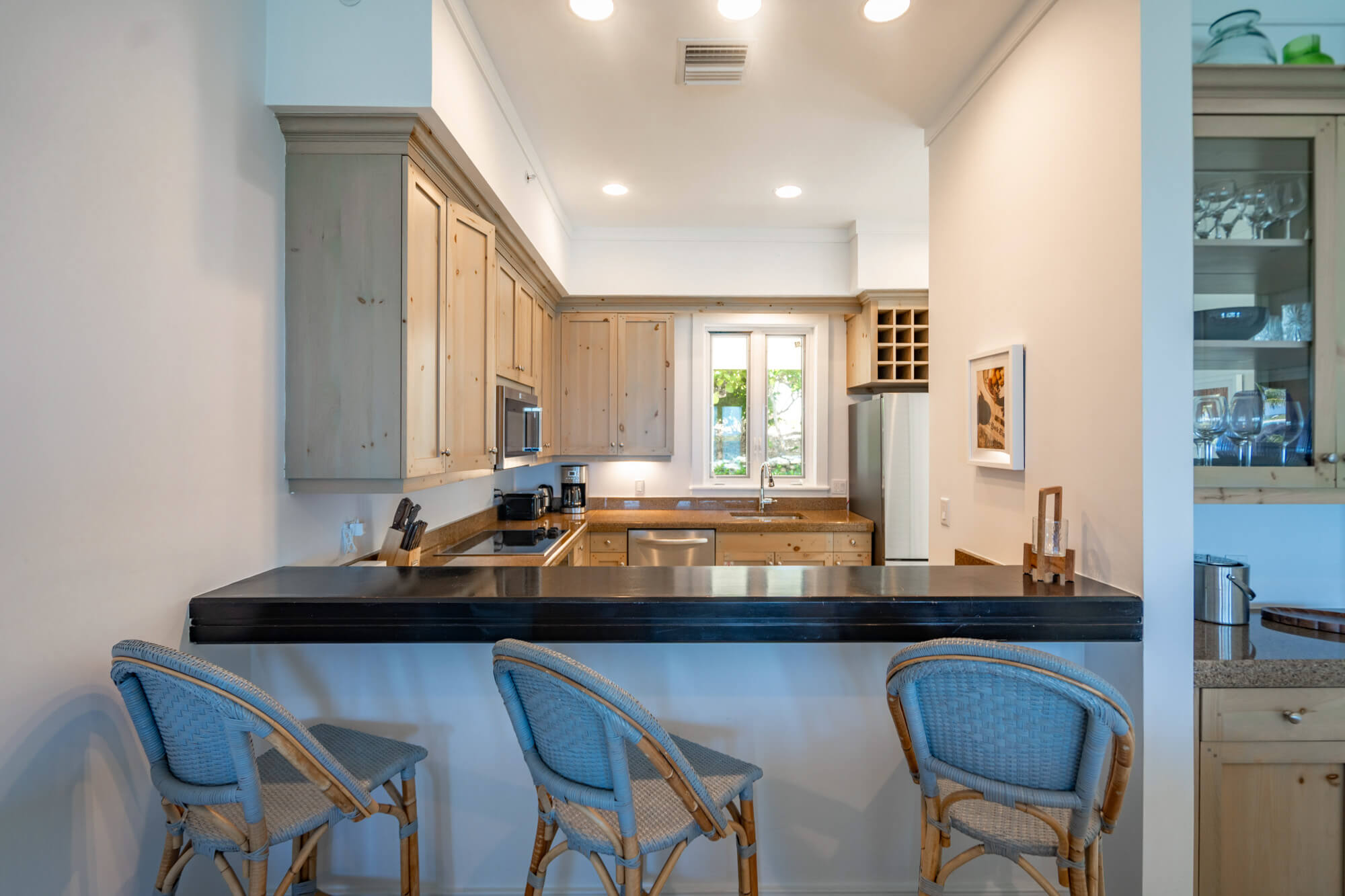 Lucky Old Sun opens to a light-filled great room framed by wide windows and glass doors that draw your eye straight to the turquoise water beyond. The living area feels airy and relaxed, with woven leather lounge chairs, soft blush accent seating, and pale textures layered over wide-plank floors. Just beyond, the dining space flows easily into the open kitchen, where warm wood cabinetry, granite countertops, stainless appliances, and bar seating create an inviting hub for gathering. A glass-front bar cabinet and wine storage add a thoughtful touch for evenings in.