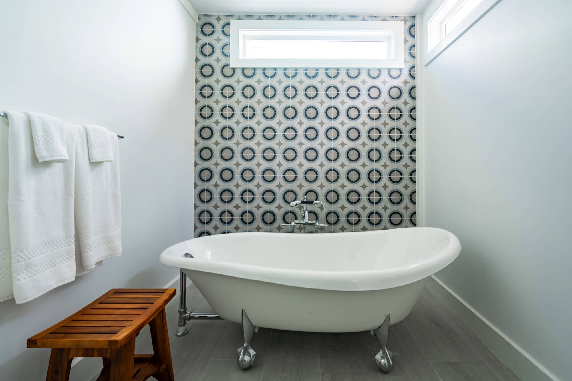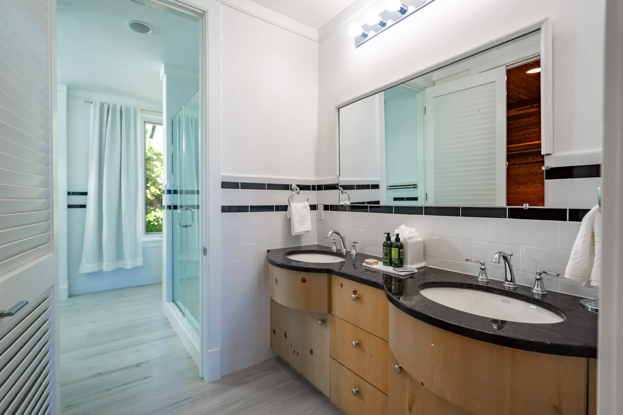On the main level, the bedroom to the right offers a king bed and a spacious bath with a double vanity, a walk-in shower, and a soaking tub. Doors open directly to the back porch, creating a seamless indoor–outdoor rhythm. The bedroom to the left features a queen bed and its own walk-in shower, offering privacy and comfort in soft coastal finishes.