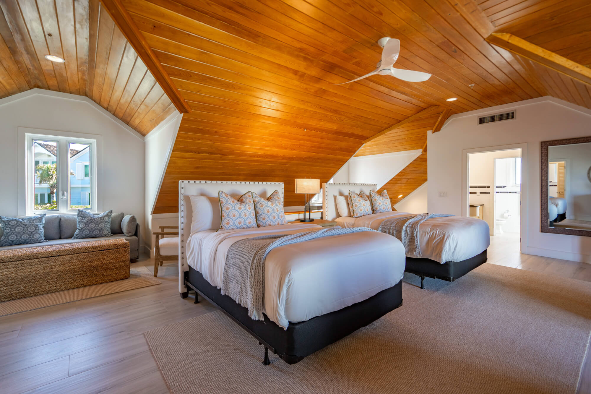 Upstairs, an open loft features two double beds tucked beneath a dramatic vaulted ceiling clad in rich wood paneling. The architectural lines create a sense of warmth and character, while each room enjoys its own adjoining bath with a walk-in shower and a private water closet. A small sitting nook beneath the eaves offers a quiet place to read or unwind.