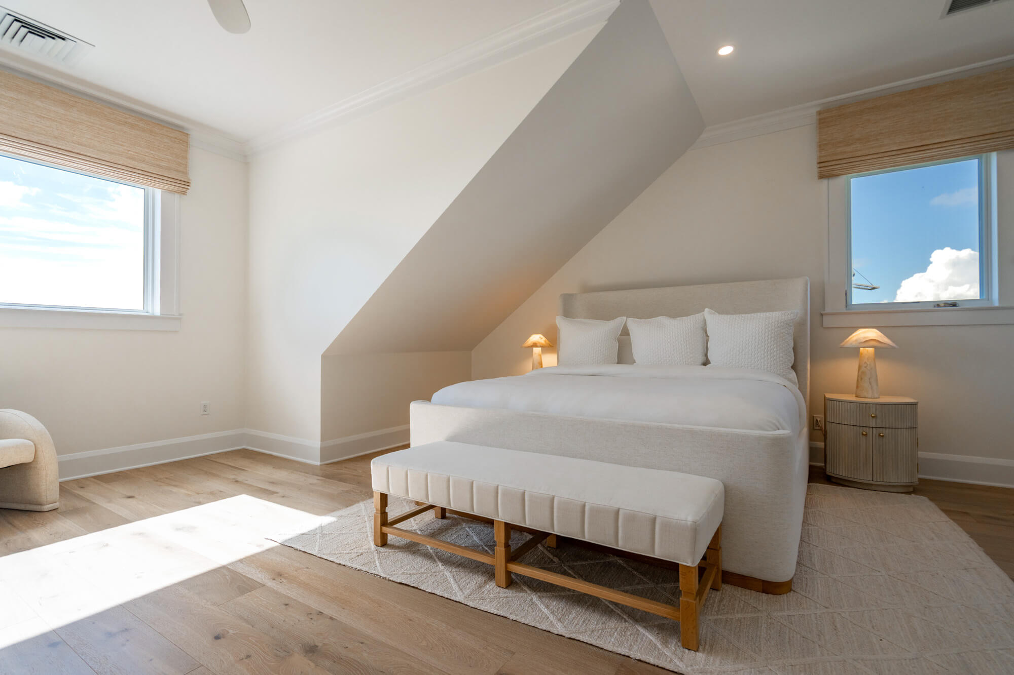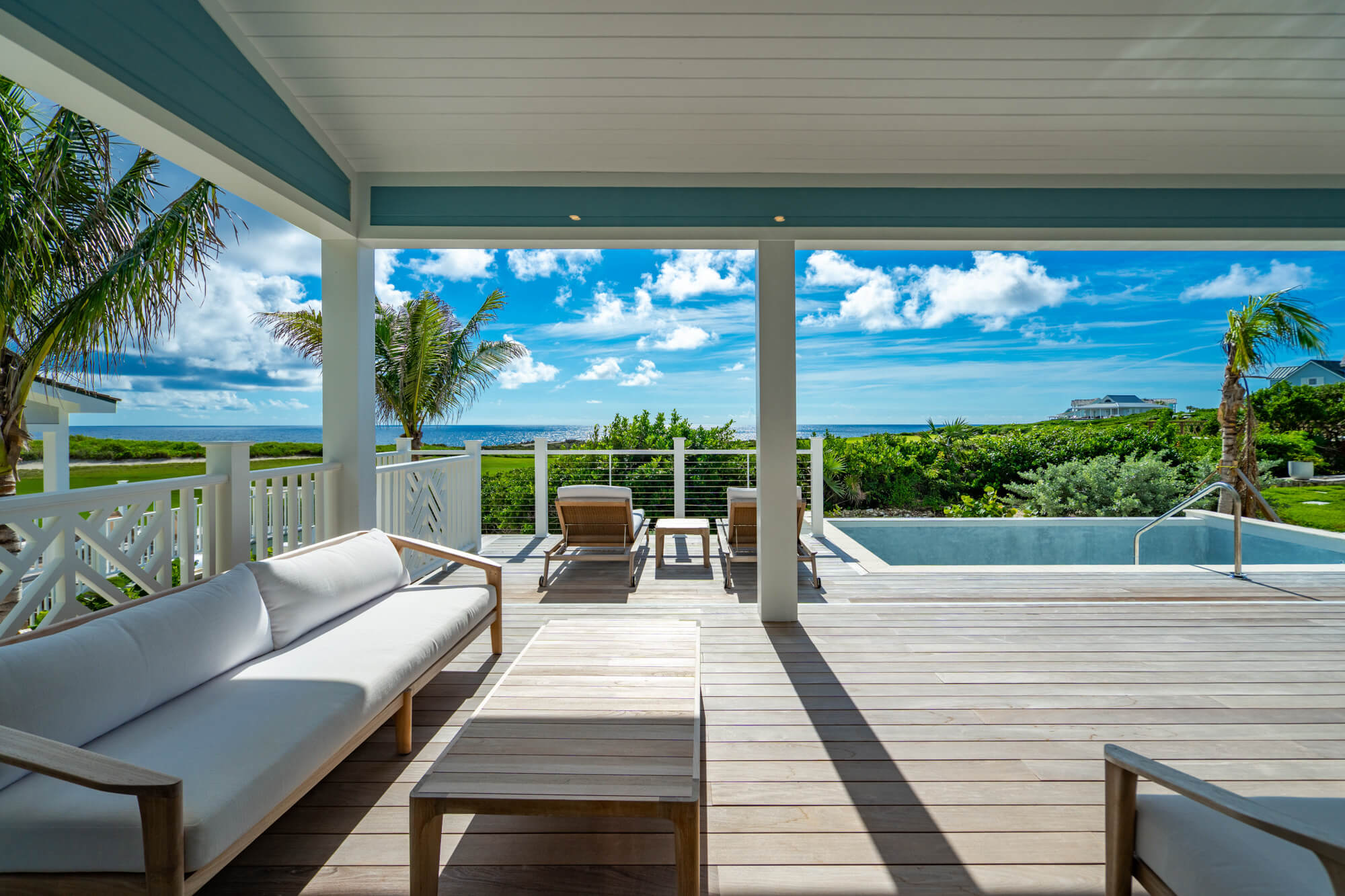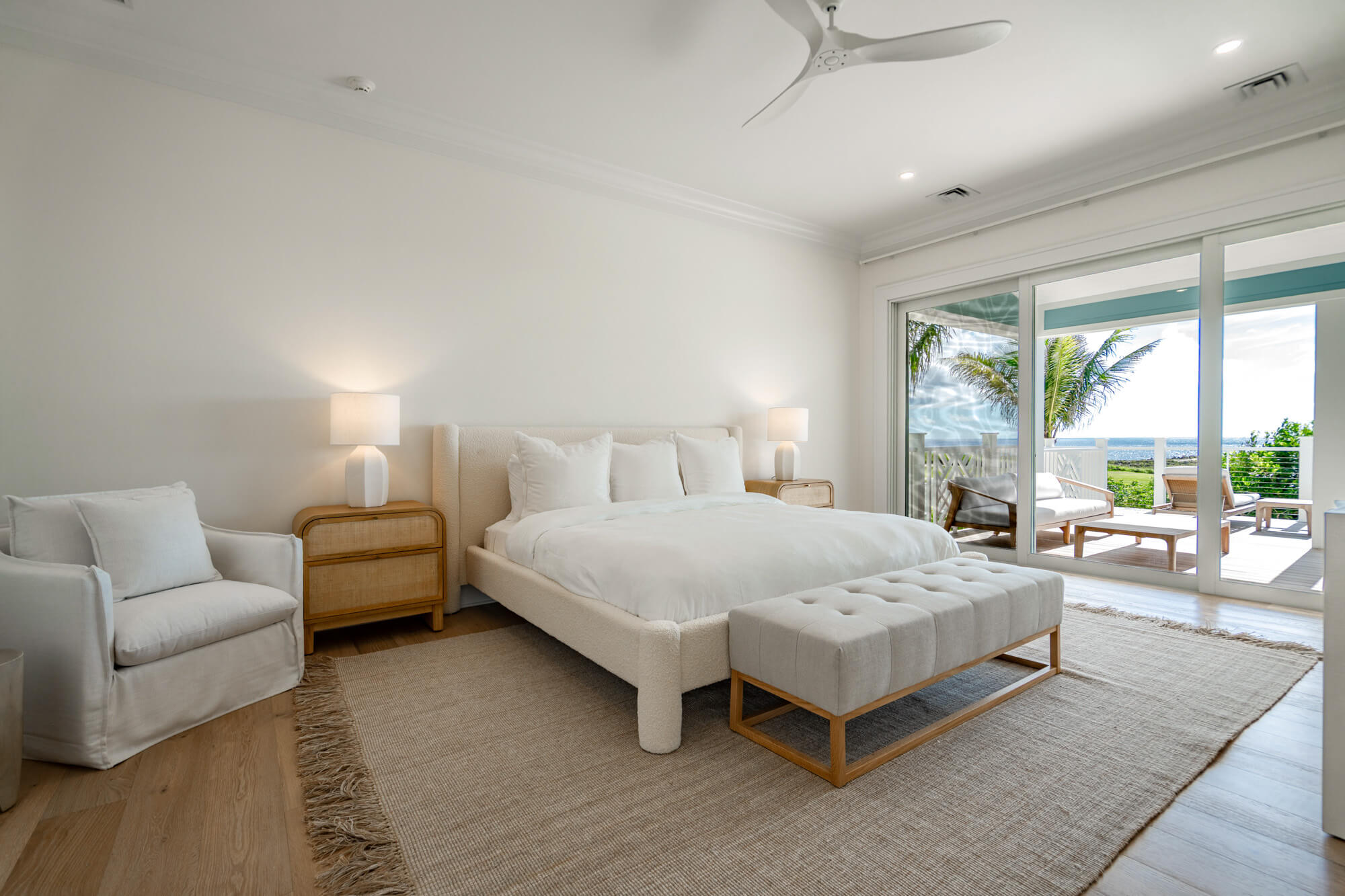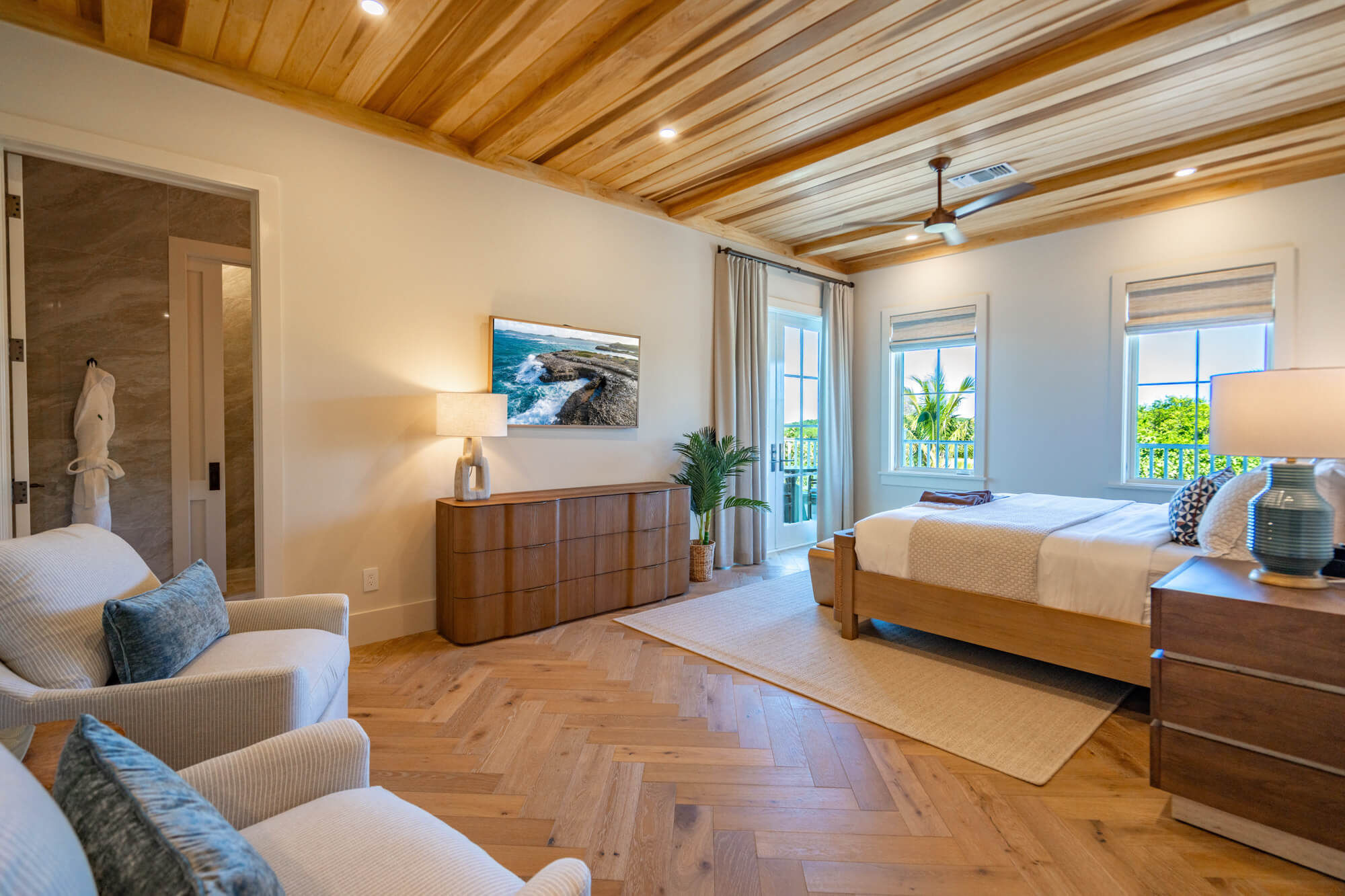 At the front of the home, a king bedroom offers a private sitting area and an ensuite bath with a shower/tub combination—ideal for guests who appreciate a little extra space. The primary suite opens directly to the back patio and infinity pool and includes a quiet single-chair sofa for morning coffee or evening wind-downs. Its ensuite bath features double sinks and a large walk-in shower.