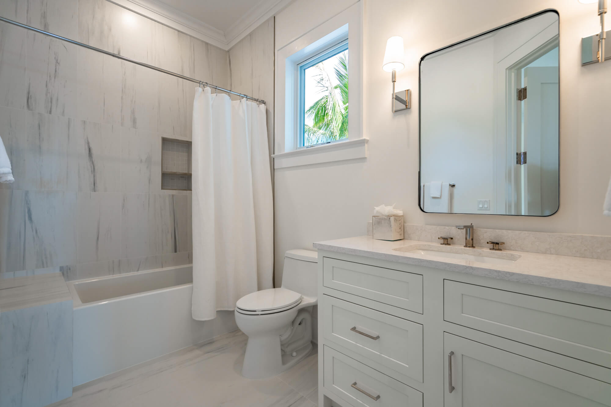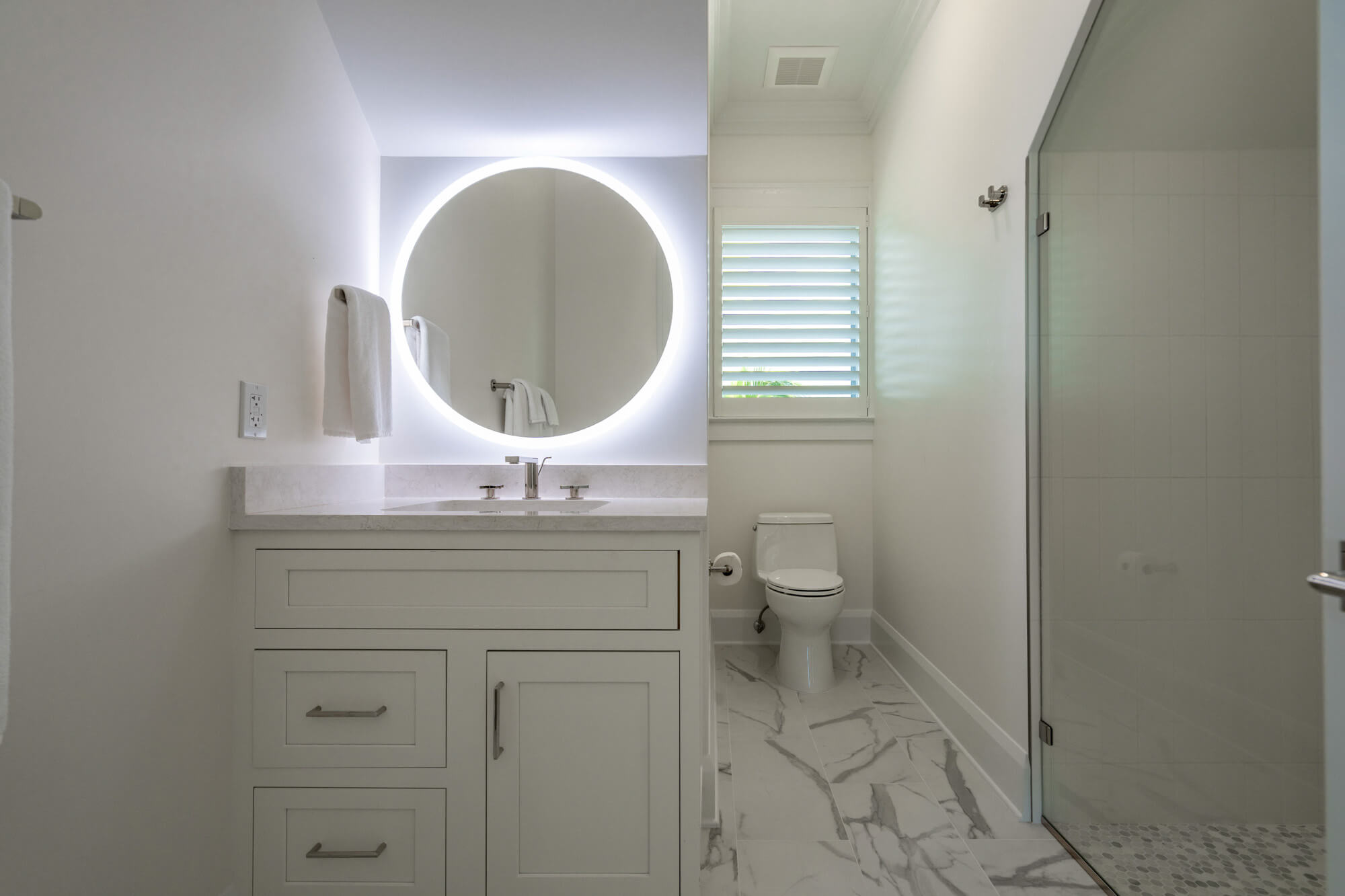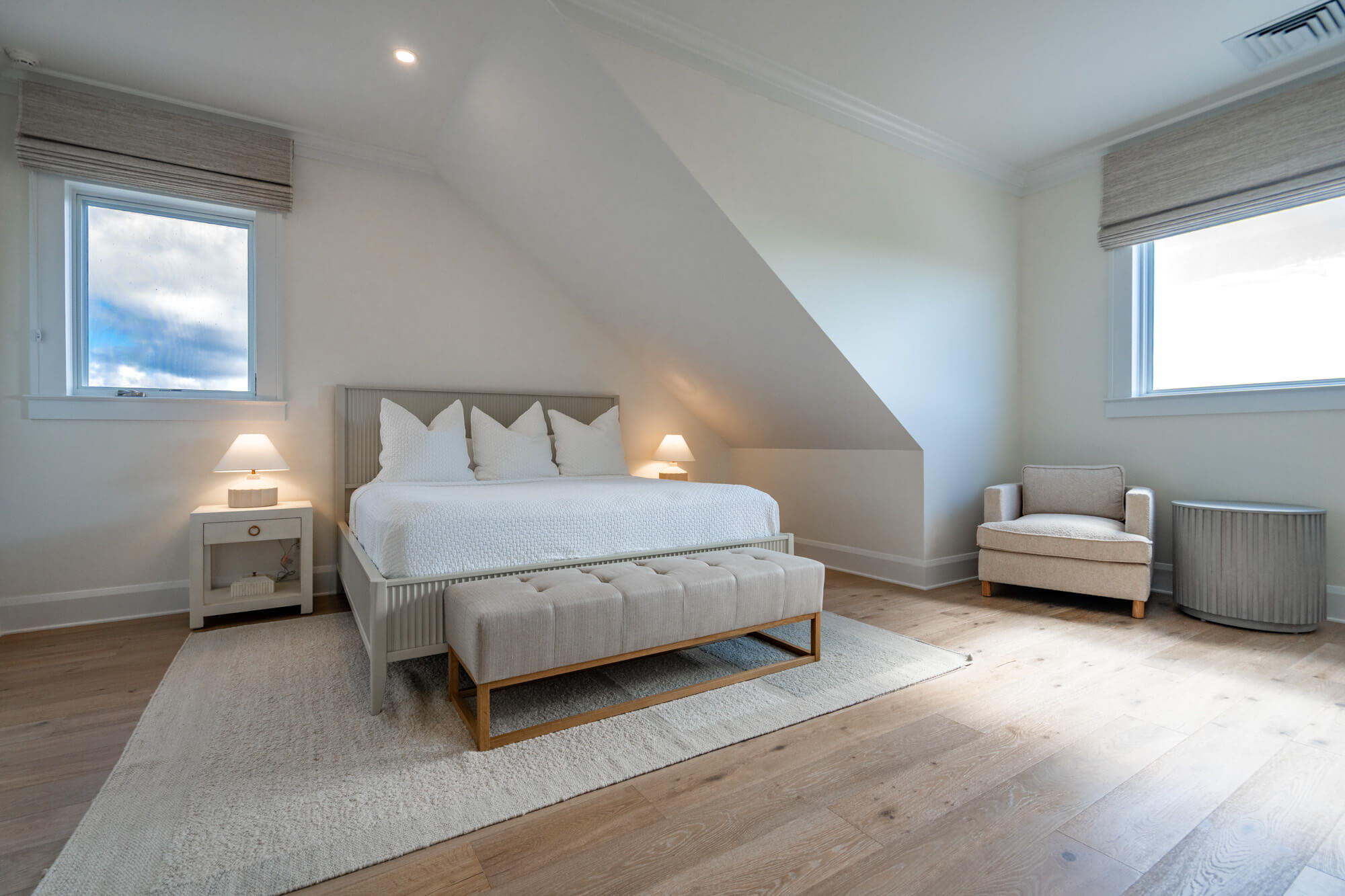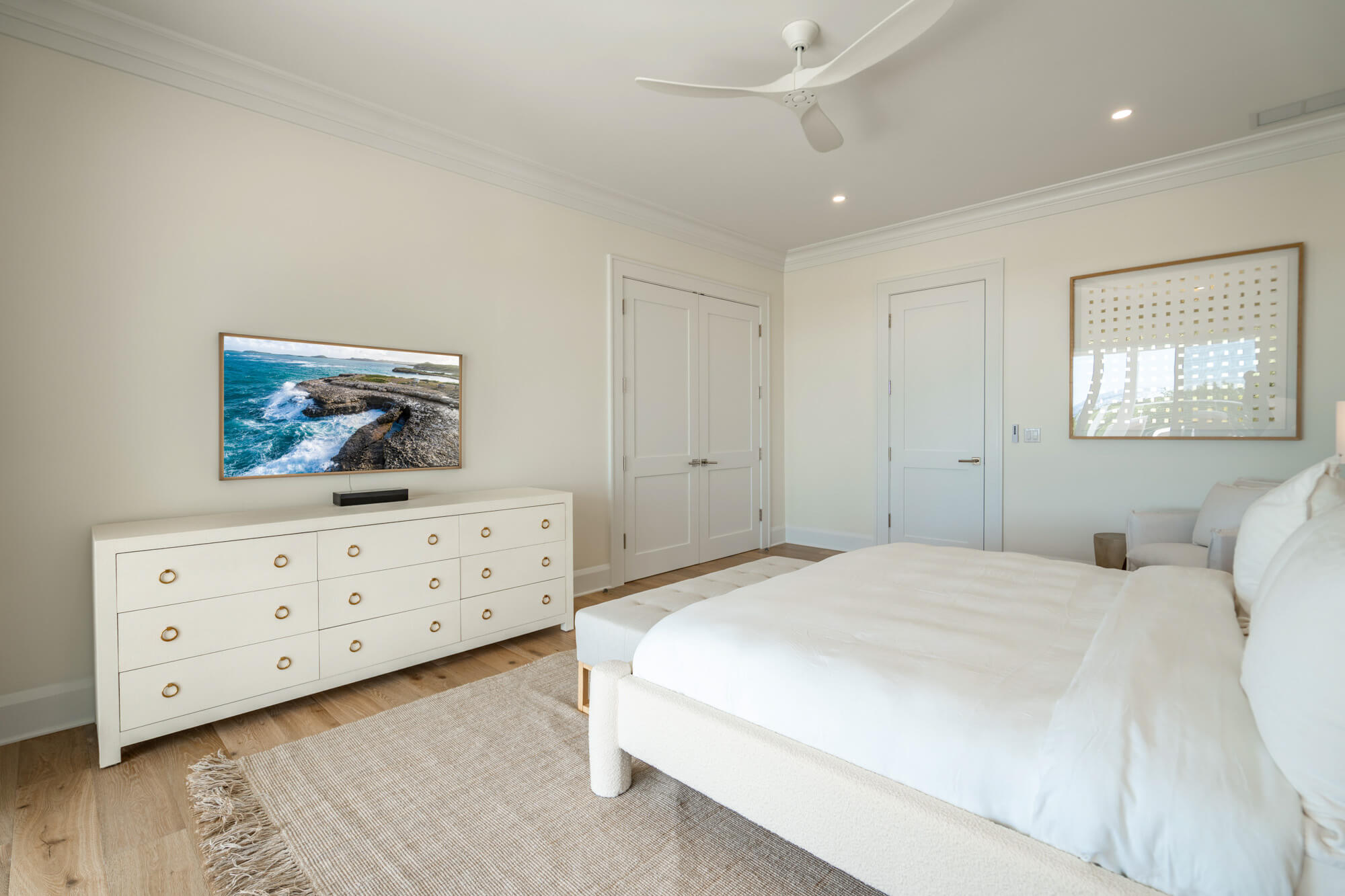 At the front of the home, a king bedroom offers a private sitting area and an ensuite bath with a shower/tub combination—ideal for guests who appreciate a little extra space. The primary suite opens directly to the back patio and infinity pool and includes a quiet single-chair sofa for morning coffee or evening wind-downs. Its ensuite bath features double sinks and a large walk-in shower.