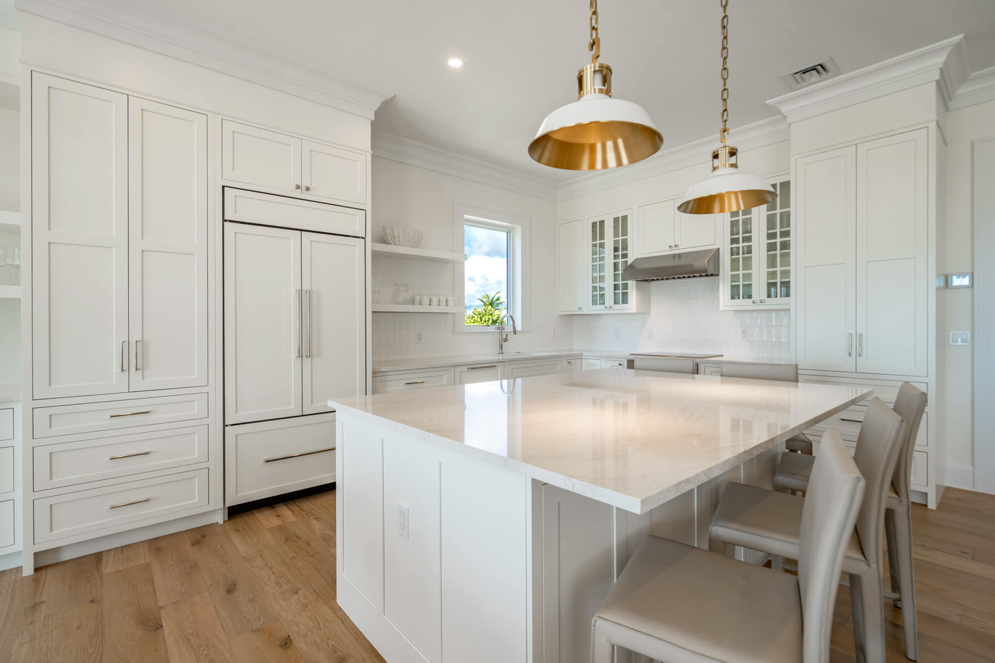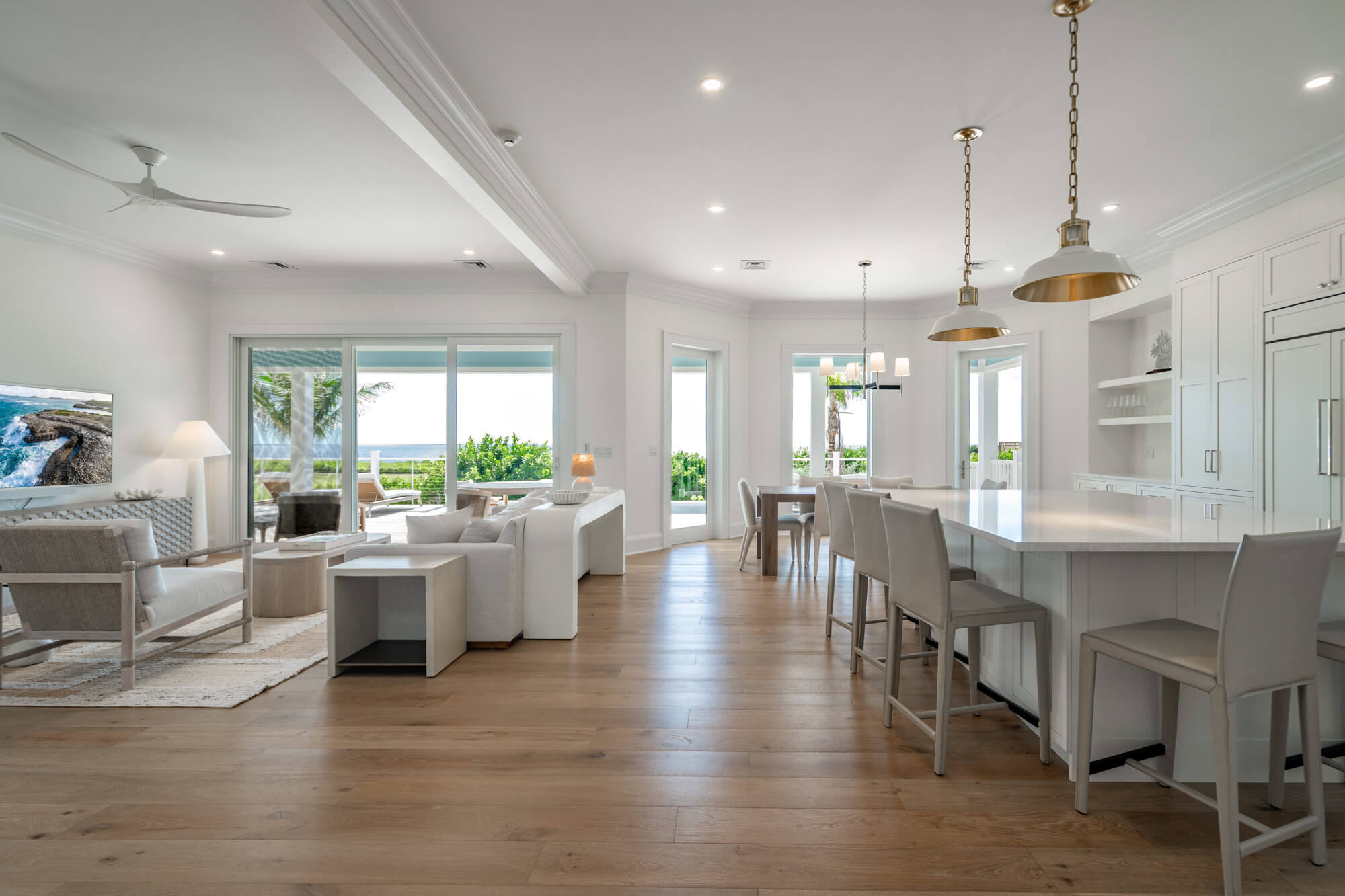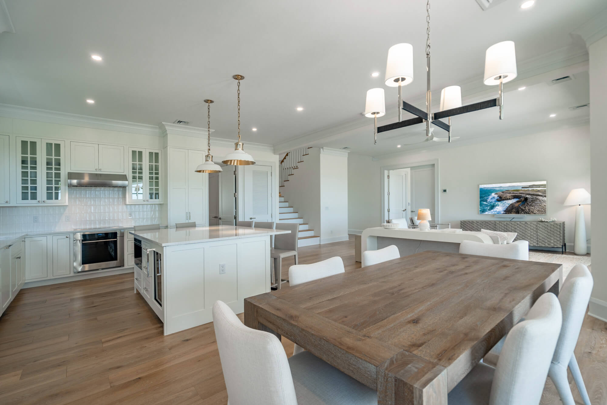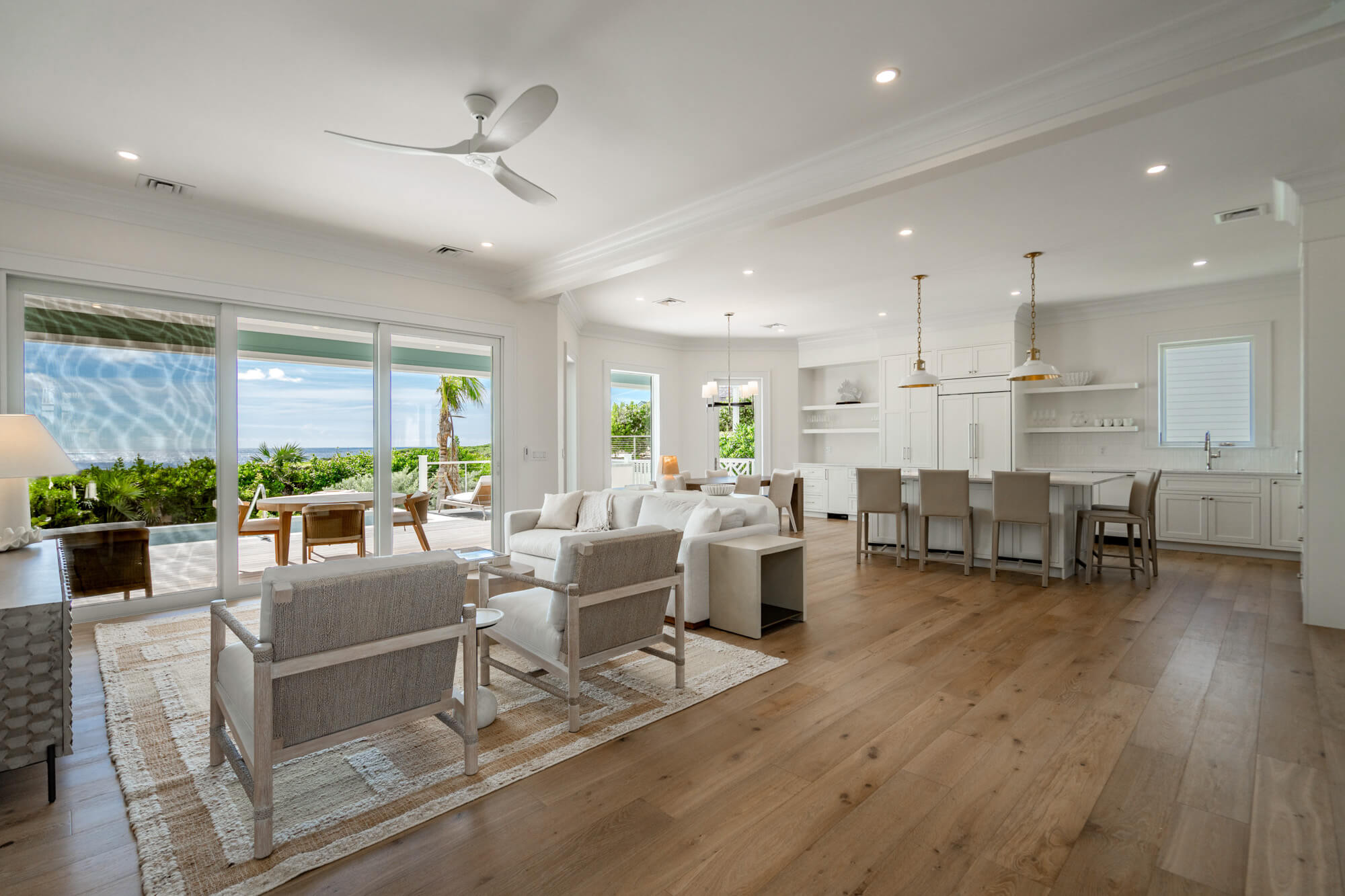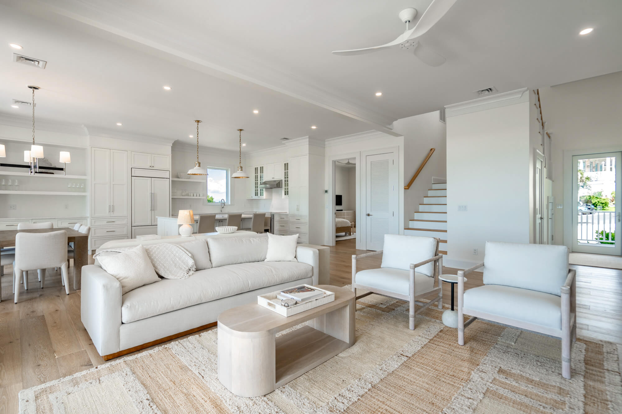 The main living level opens fully to the back patio through wide sliding doors, creating a seamless flow between the interior and the outdoors. Inside, the kitchen features crisp white cabinetry, stainless steel appliances, a generous island, and clean-lined finishes that anchor the open living and dining spaces. Light wood floors, layered textures, and thoughtful lighting give the home an airy, coastal sensibility without feeling styled or precious.