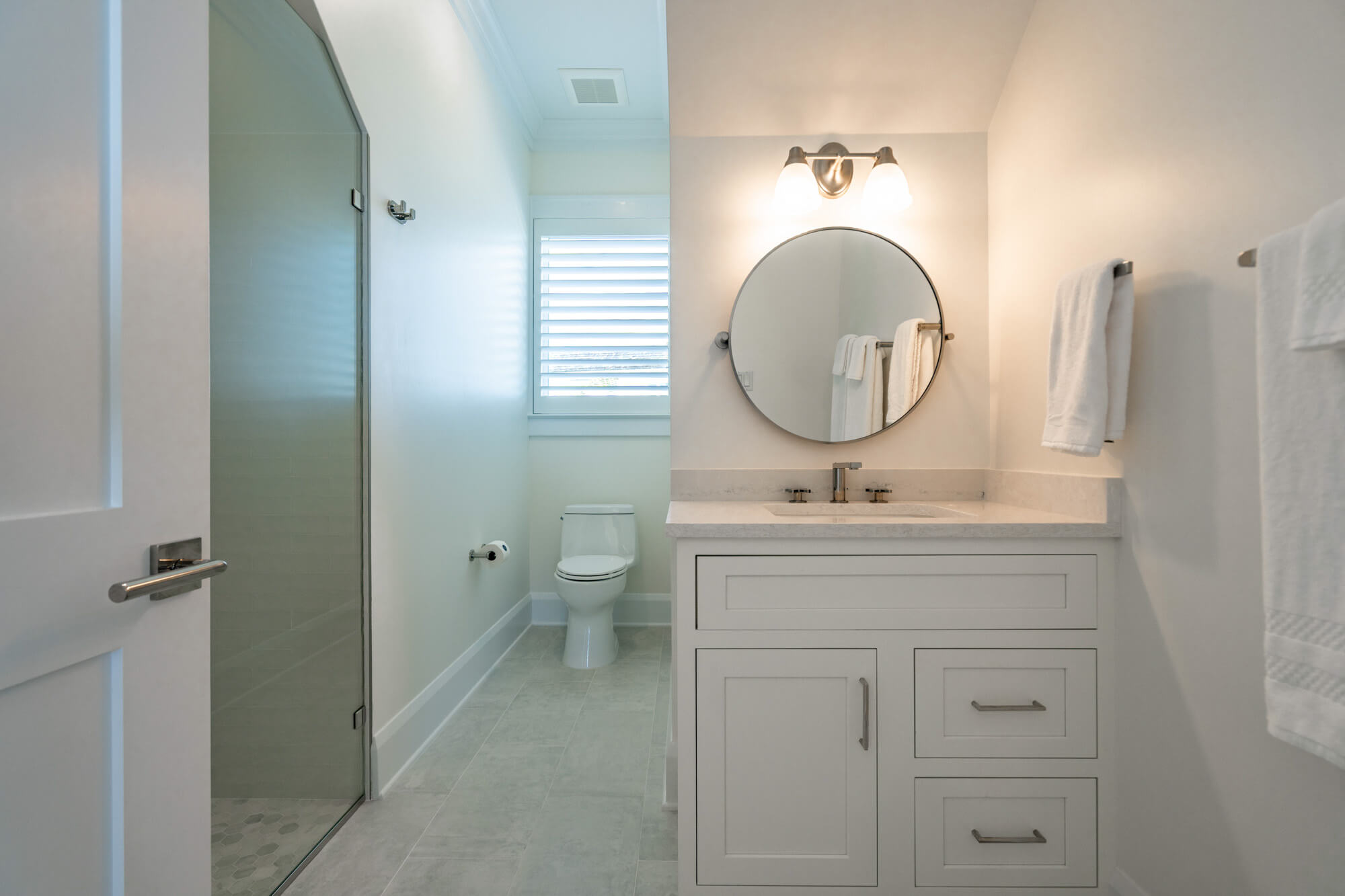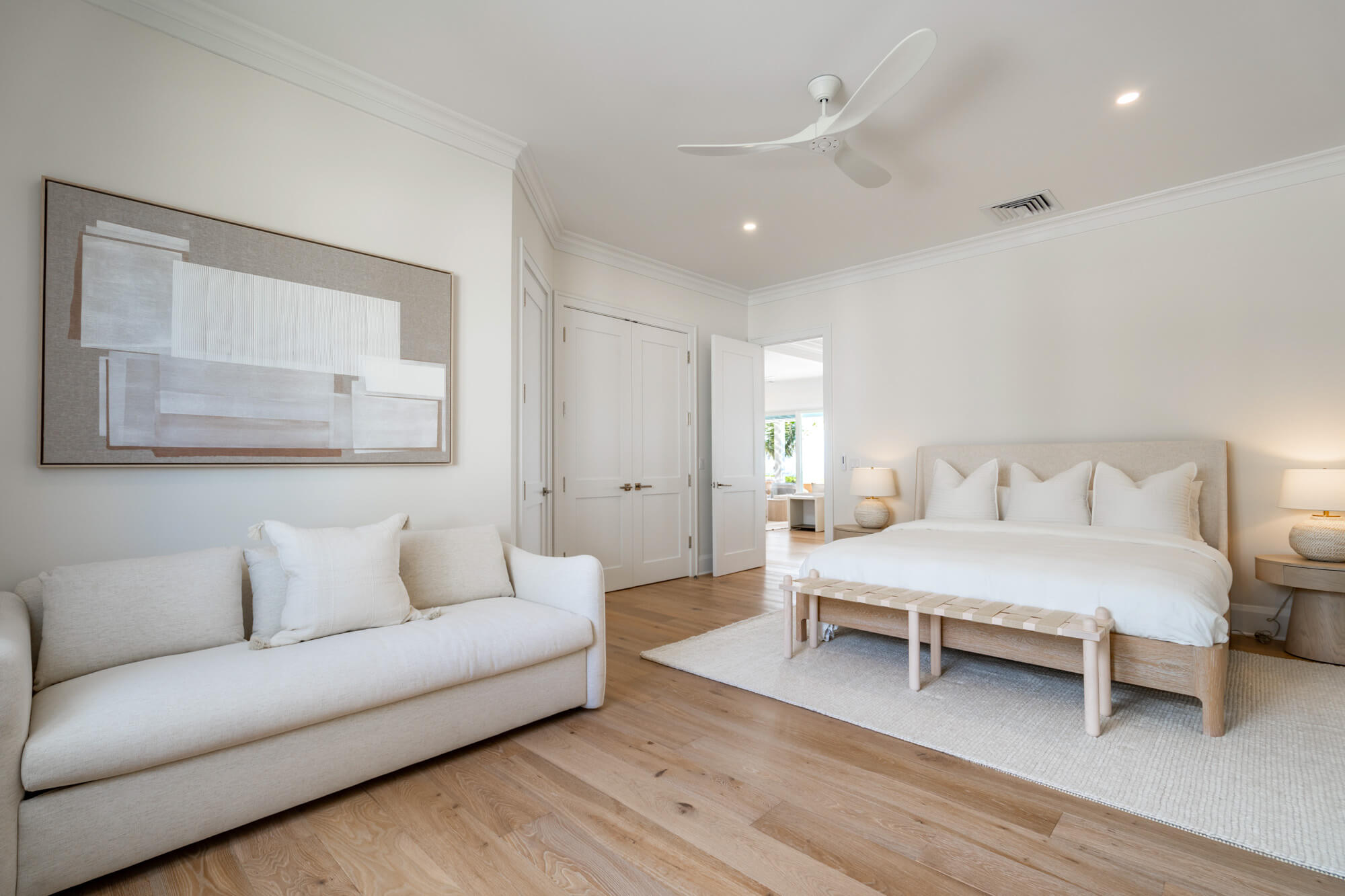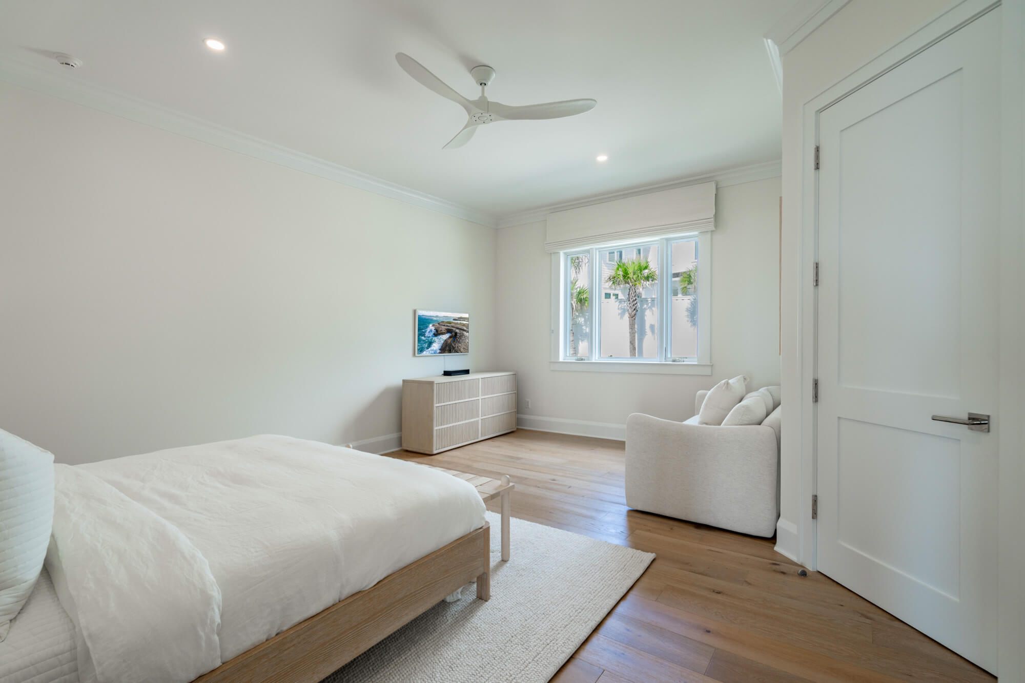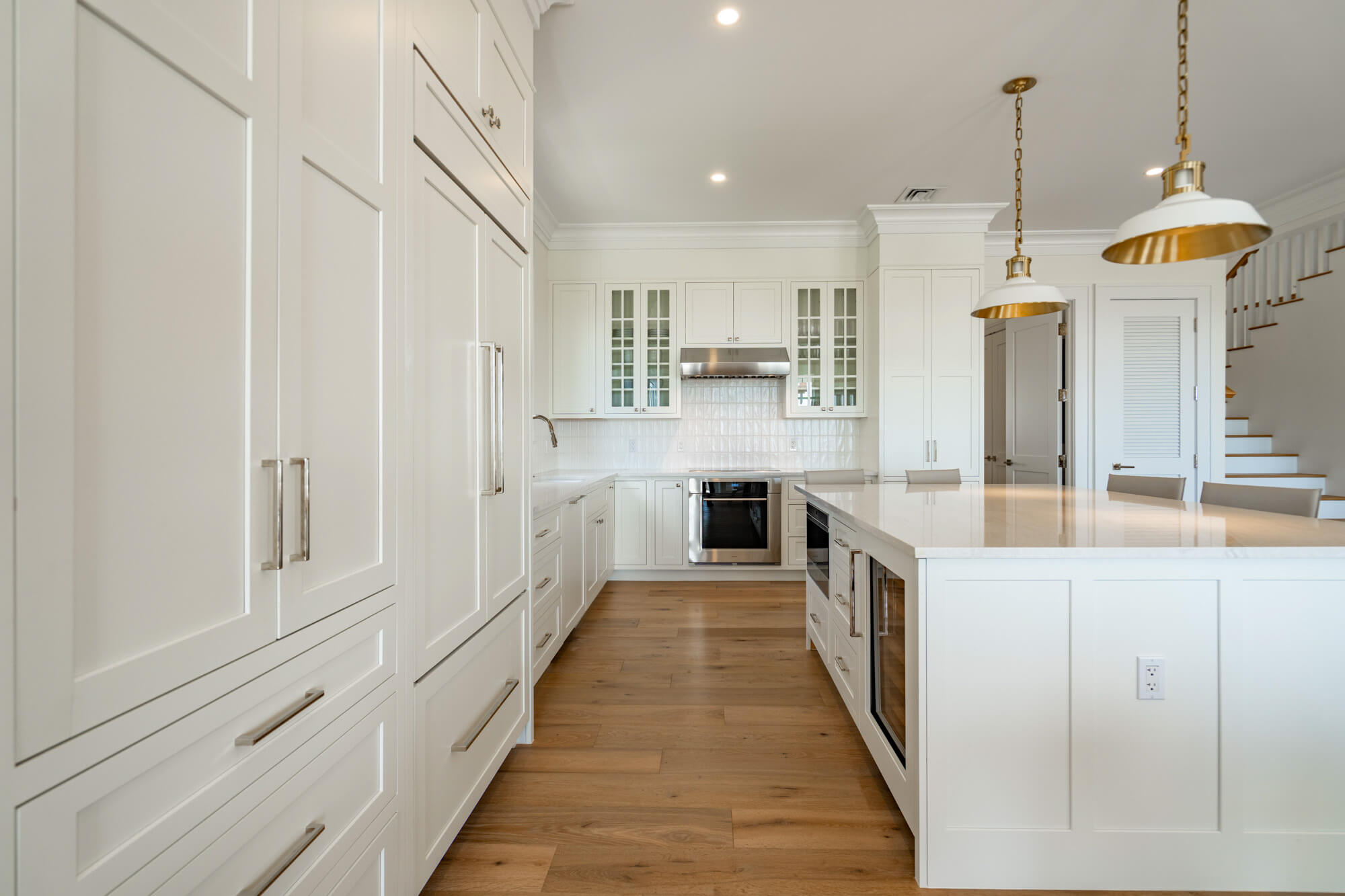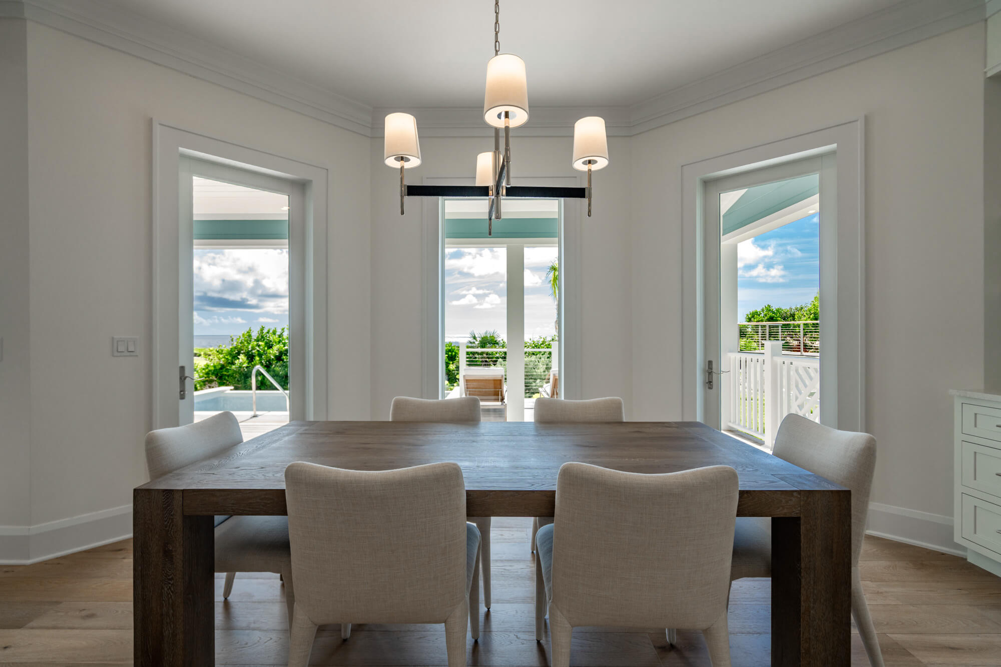 The main living level opens fully to the back patio through wide sliding doors, creating a seamless flow between the interior and the outdoors. Inside, the kitchen features crisp white cabinetry, stainless steel appliances, a generous island, and clean-lined finishes that anchor the open living and dining spaces. Light wood floors, layered textures, and thoughtful lighting give the home an airy, coastal sensibility without feeling styled or precious.
