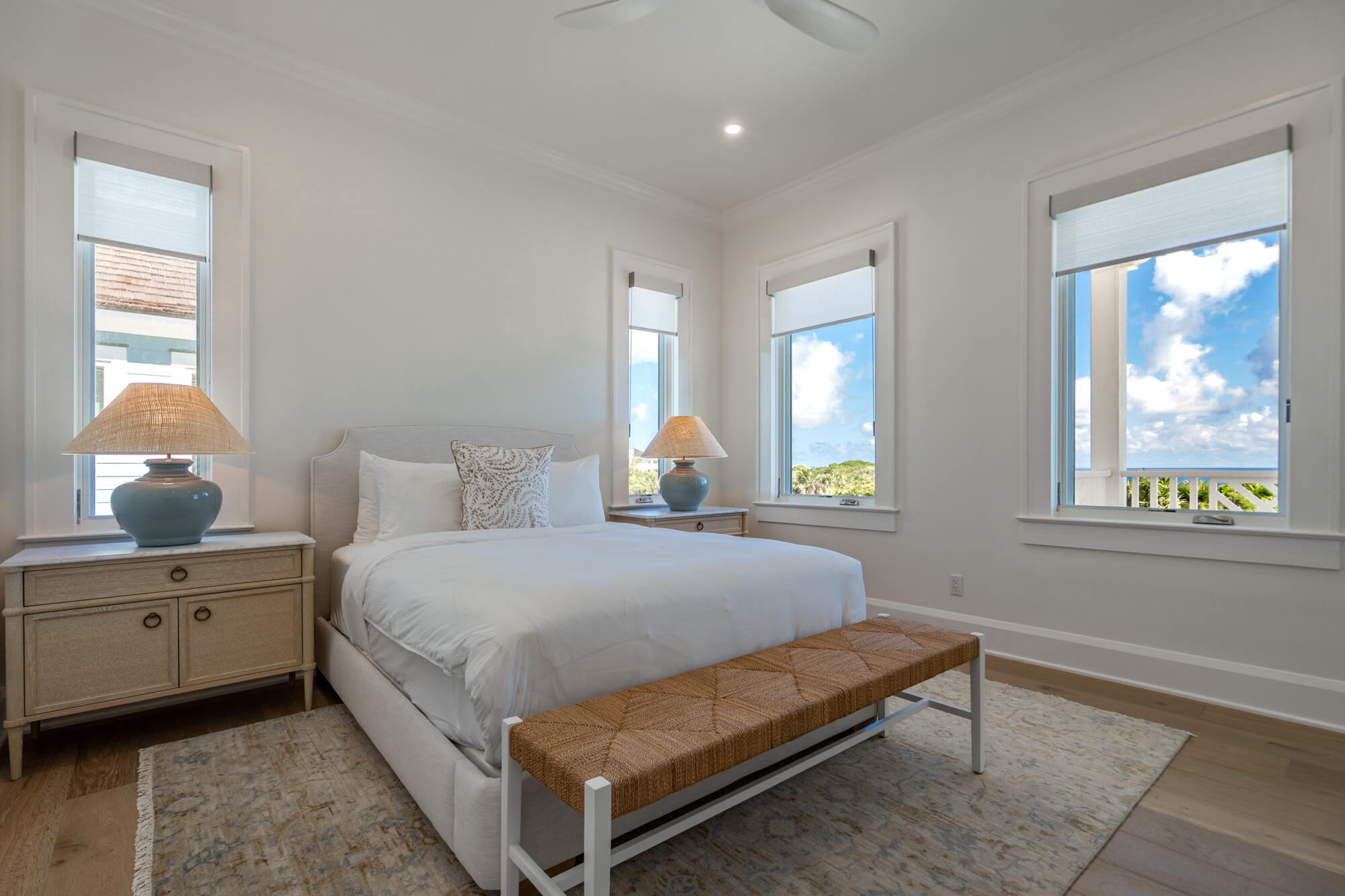 Two queen bedrooms are located on the main level, each styled with layered neutrals, natural textures, and ensuite bathrooms finished with walk-in showers or shower-tub combinations. Upstairs, two king suites offer a more elevated retreat, both with direct access to the upstairs patio. One features an ensuite bathroom with a walk-in shower, while the other includes a spa-style bathroom with double sinks, a soaking tub, and a walk-in shower.
