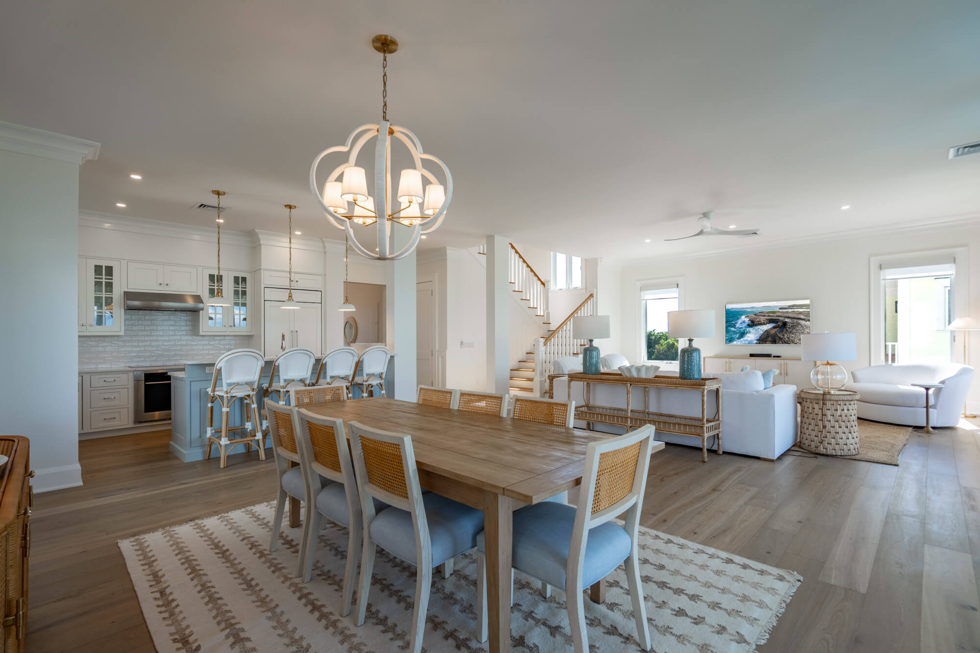 Inside, the kitchen pairs crisp white cabinetry with a soft blue island, rattan barstools, and classic pendant lighting. A spacious dining area flows easily from the kitchen and living room, making the layout equally suited for shared meals or relaxed evenings in.