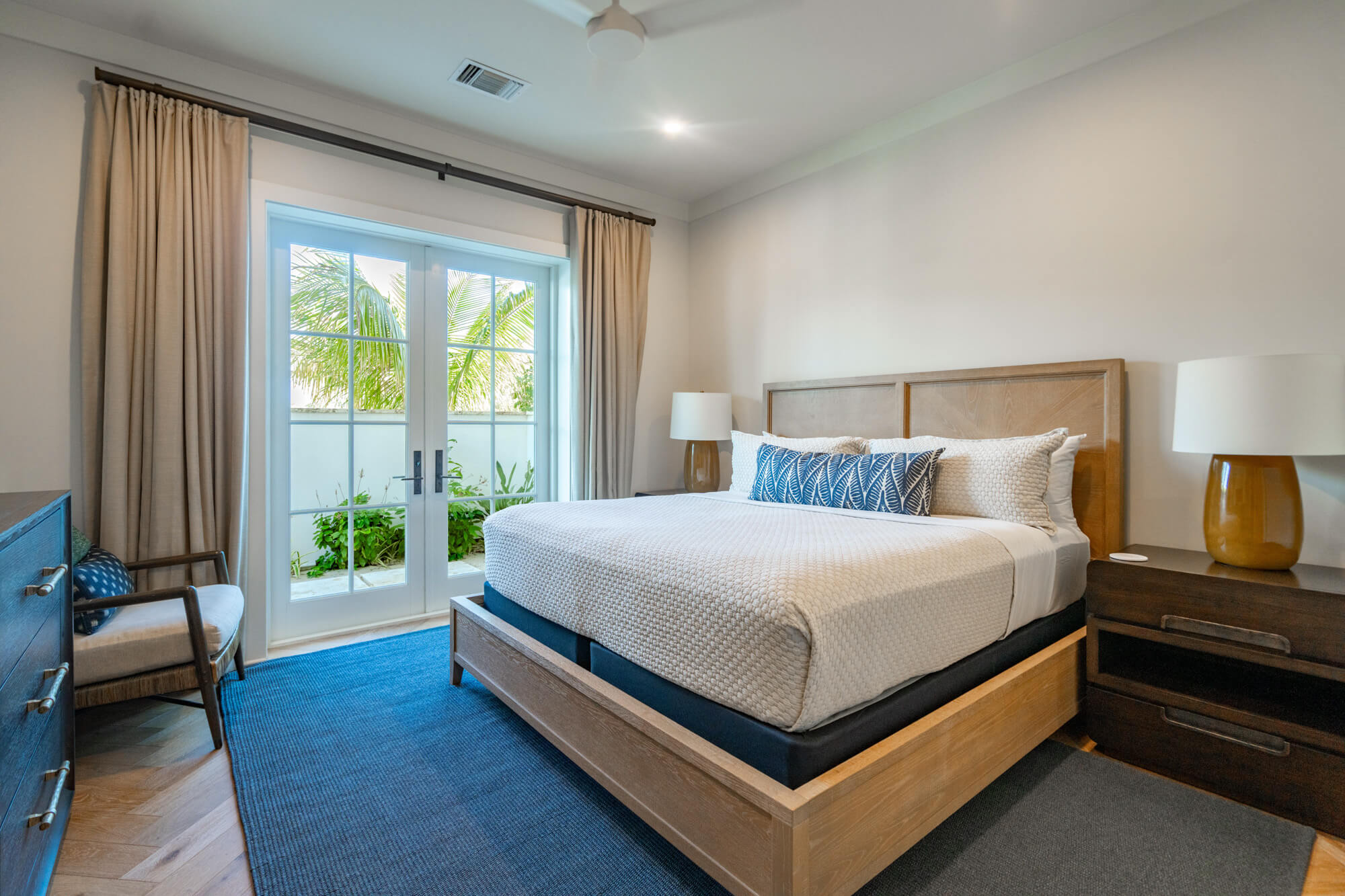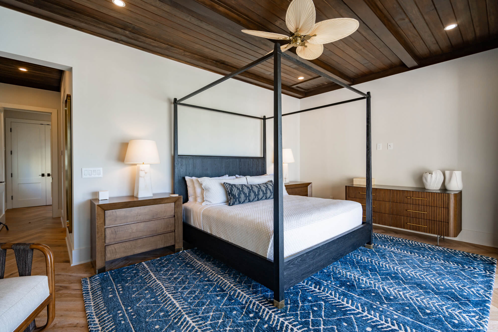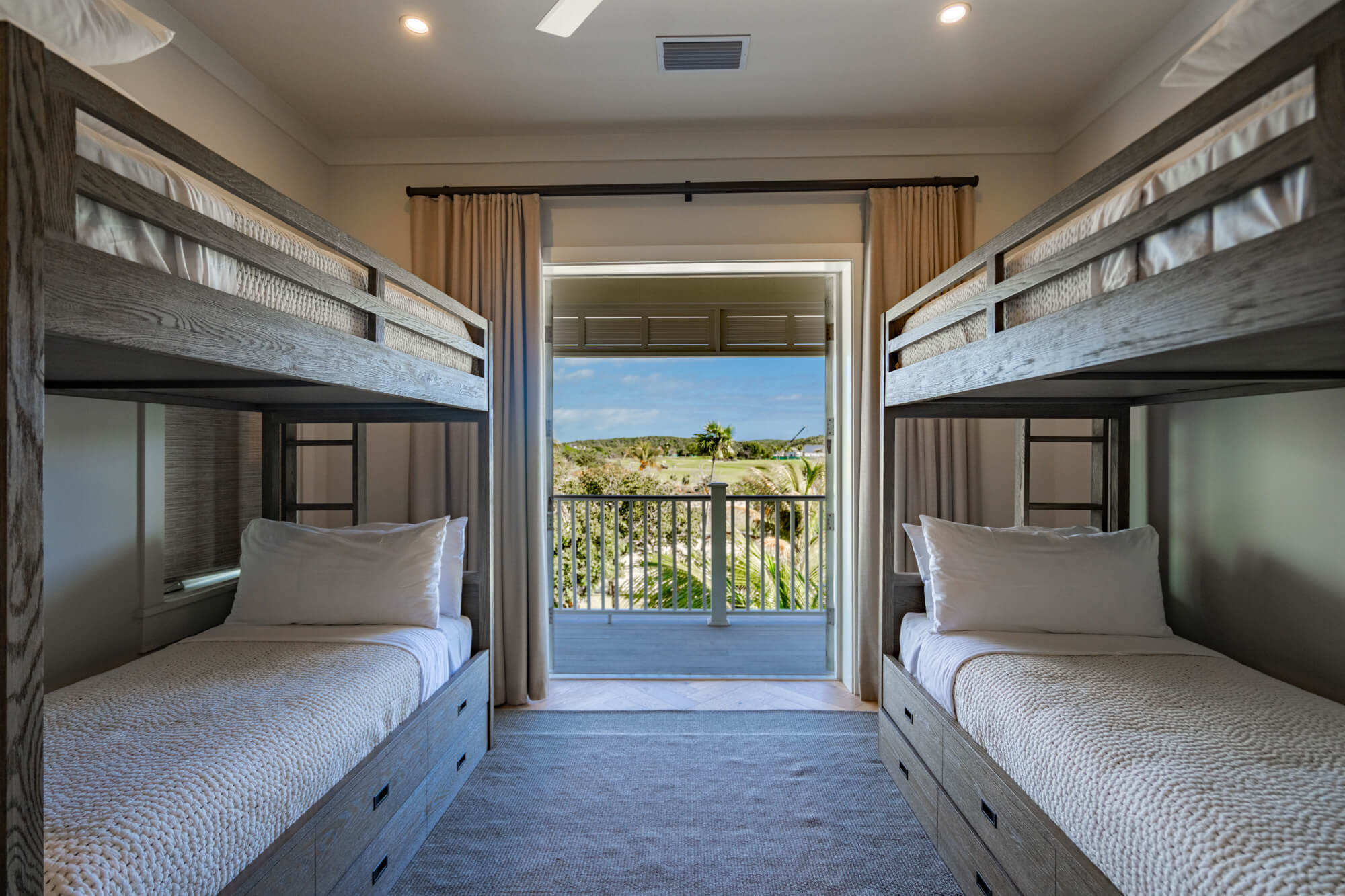 The downstairs guest bedroom opens directly to its own terrace patio, offering privacy and easy outdoor access. Upstairs, a bunk-style bedroom enjoys golf course views and its own adjoining bath with a walk-in shower and private water closet. The primary suite is positioned toward the water, centered around a king bed and finished with a double vanity, soaking tub, walk-in shower, and access to a covered porch that captures the ocean breeze.