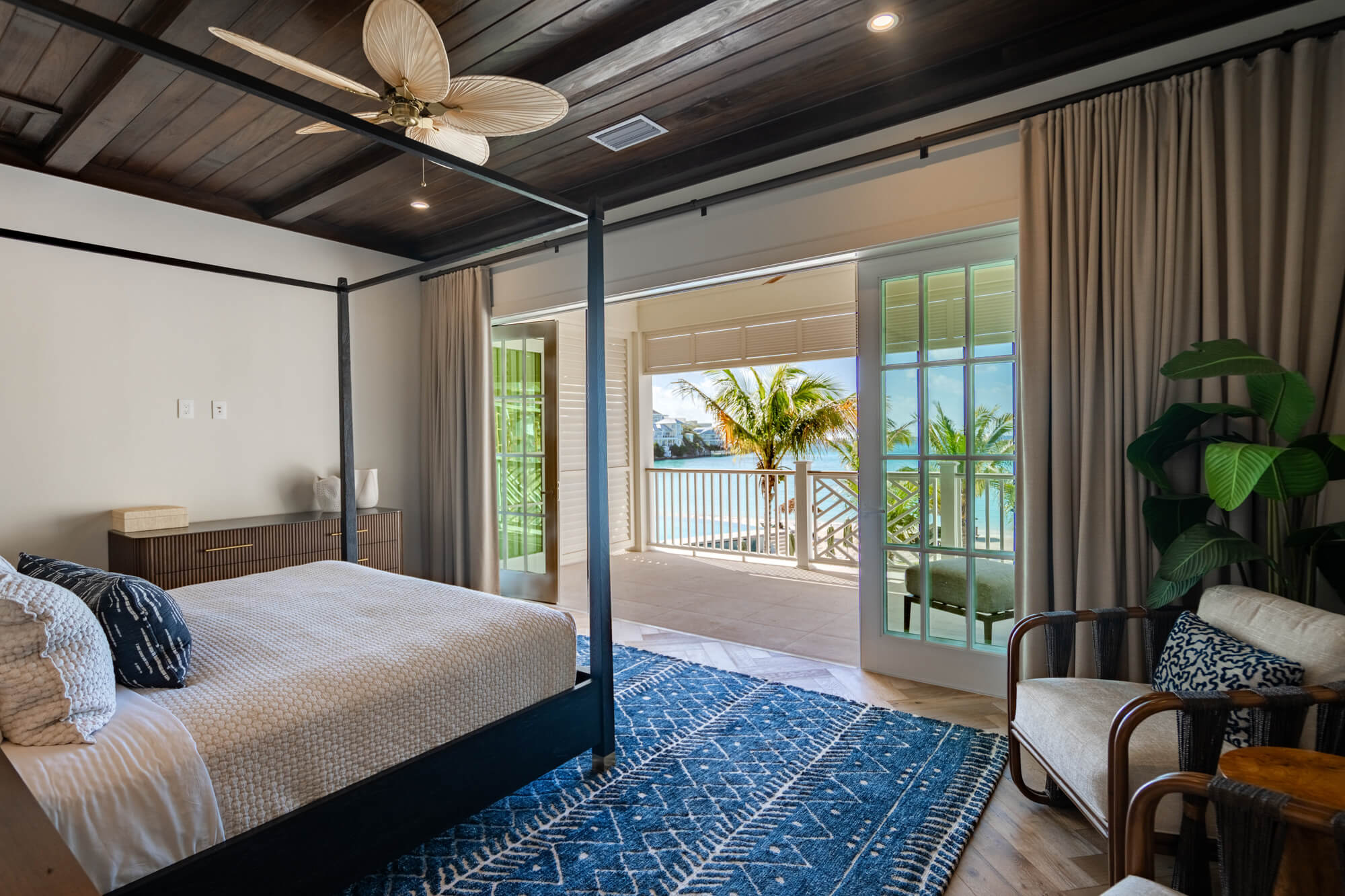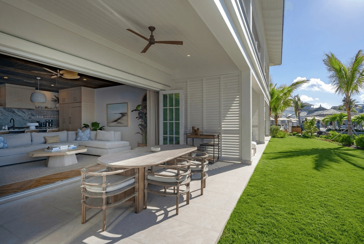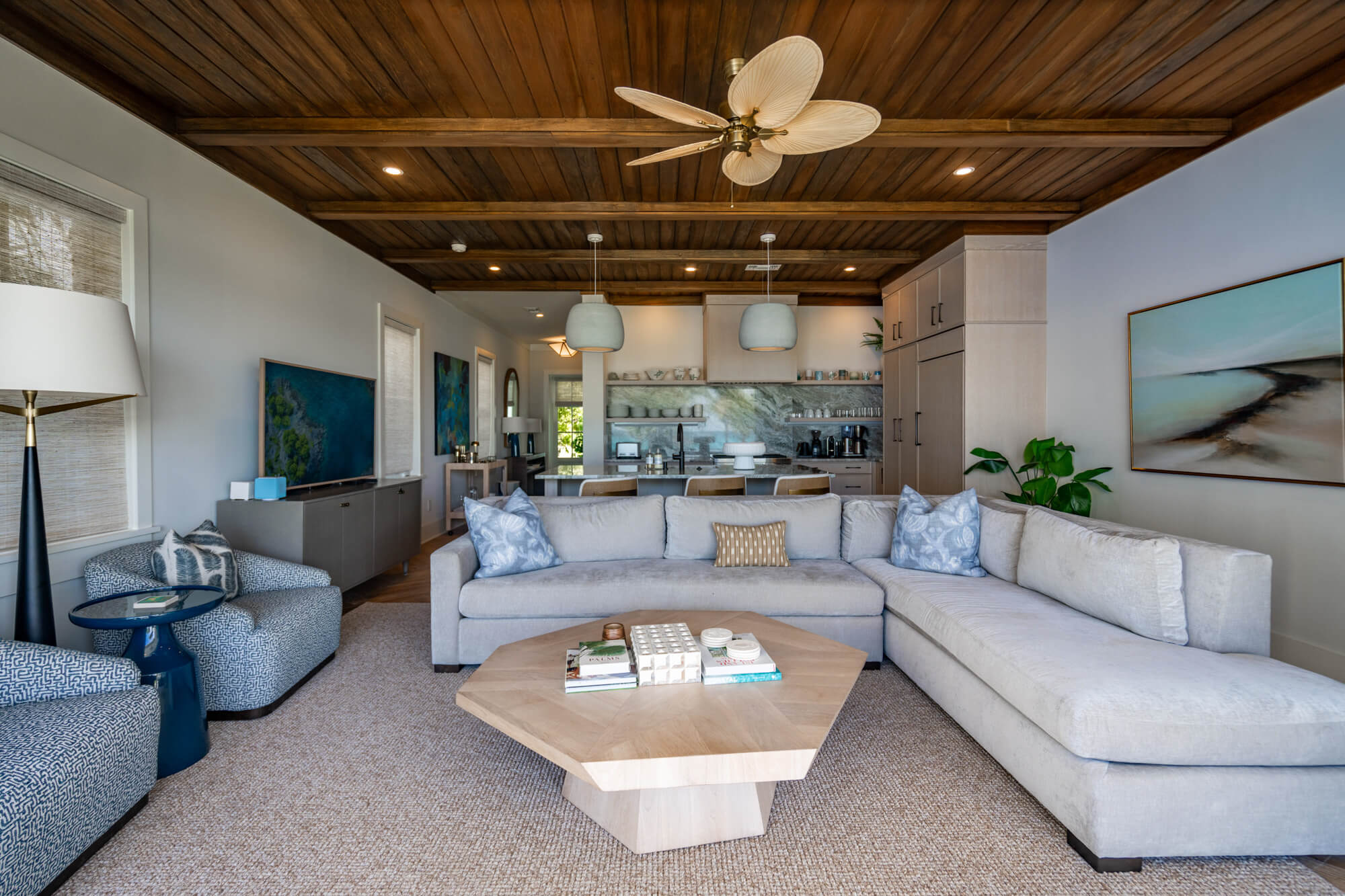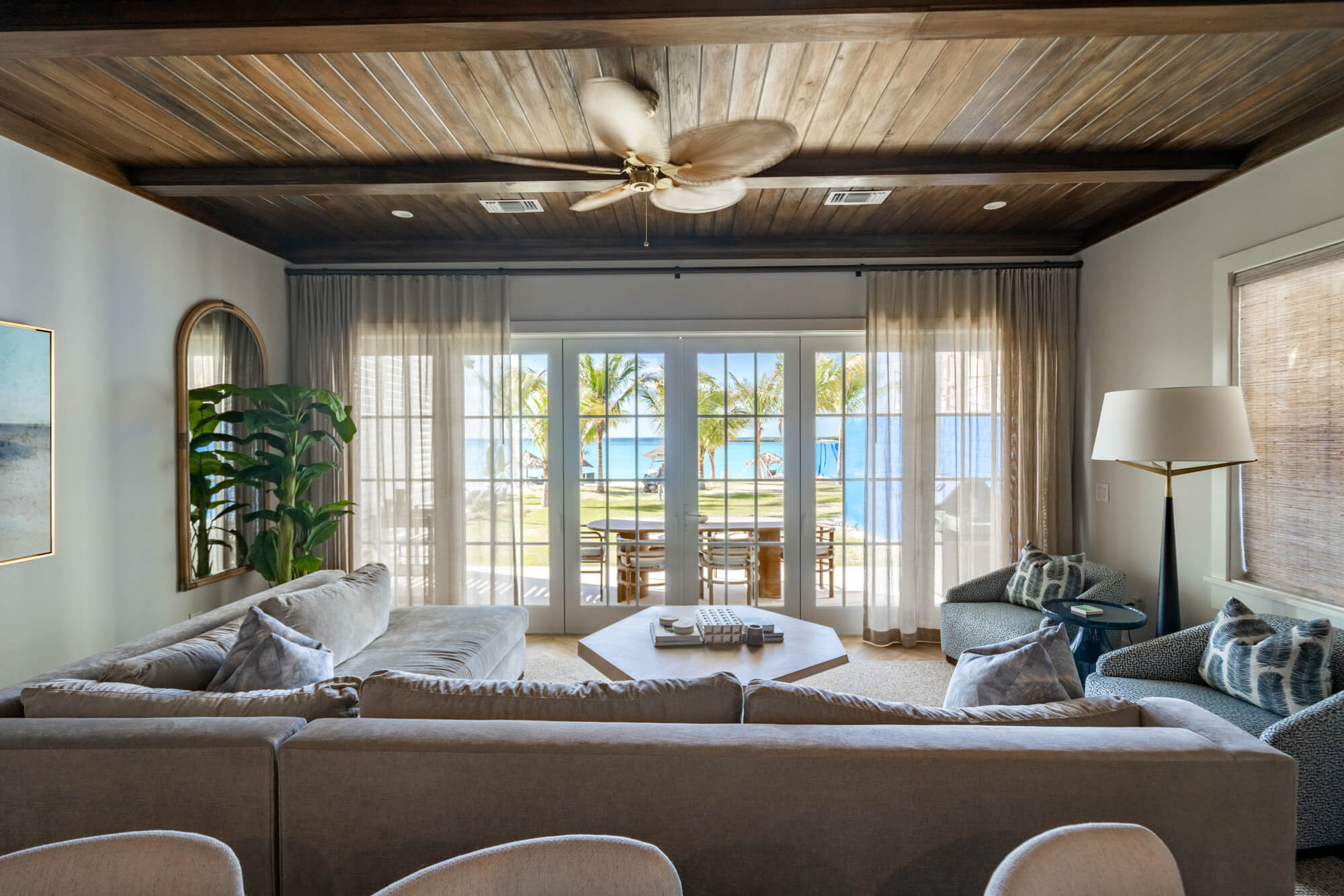 A large sectional paired with two patterned lounge chairs creates generous seating for the whole family, all oriented toward wide folding doors that open fully to the covered terrace and the turquoise sweep of Winding Bay beyond. The transition from indoors to out feels seamless, with palms and ocean just steps from the dining table.